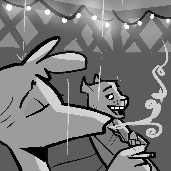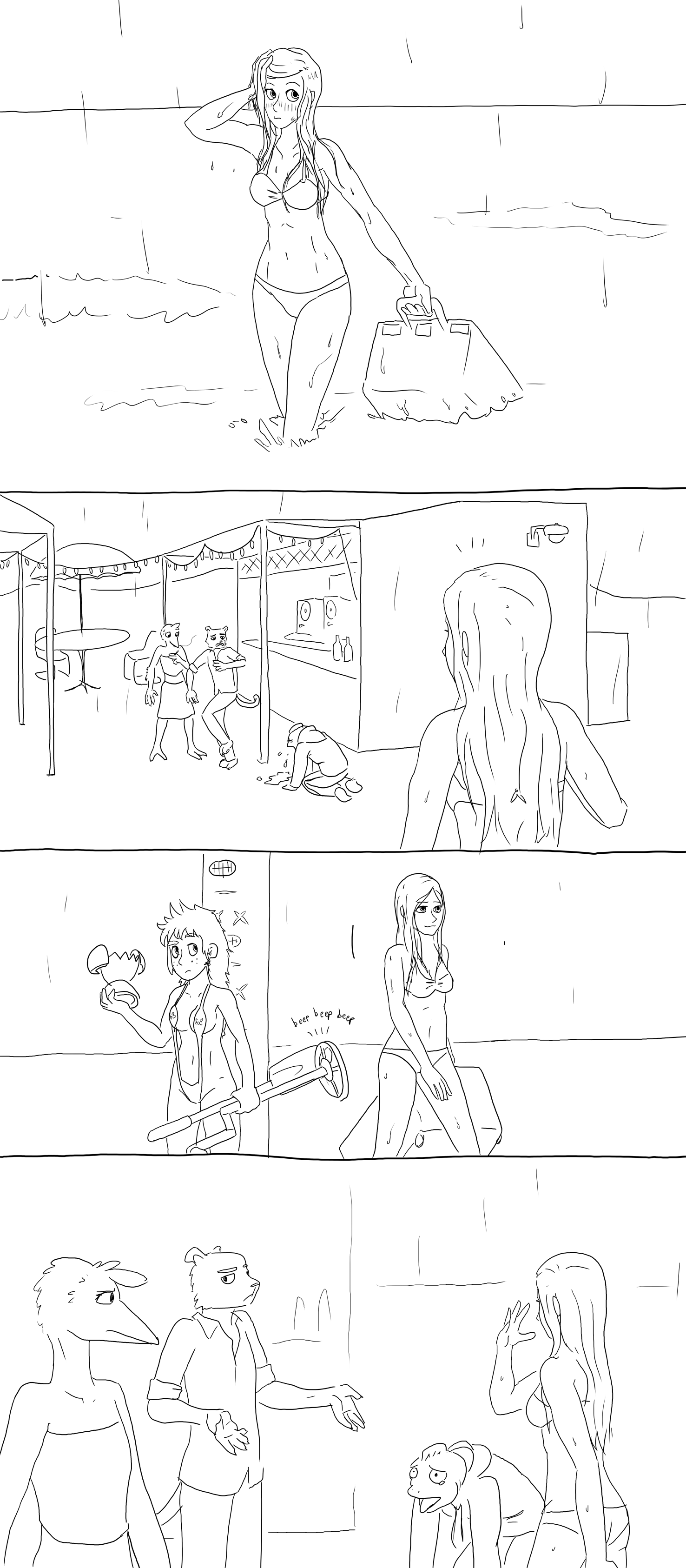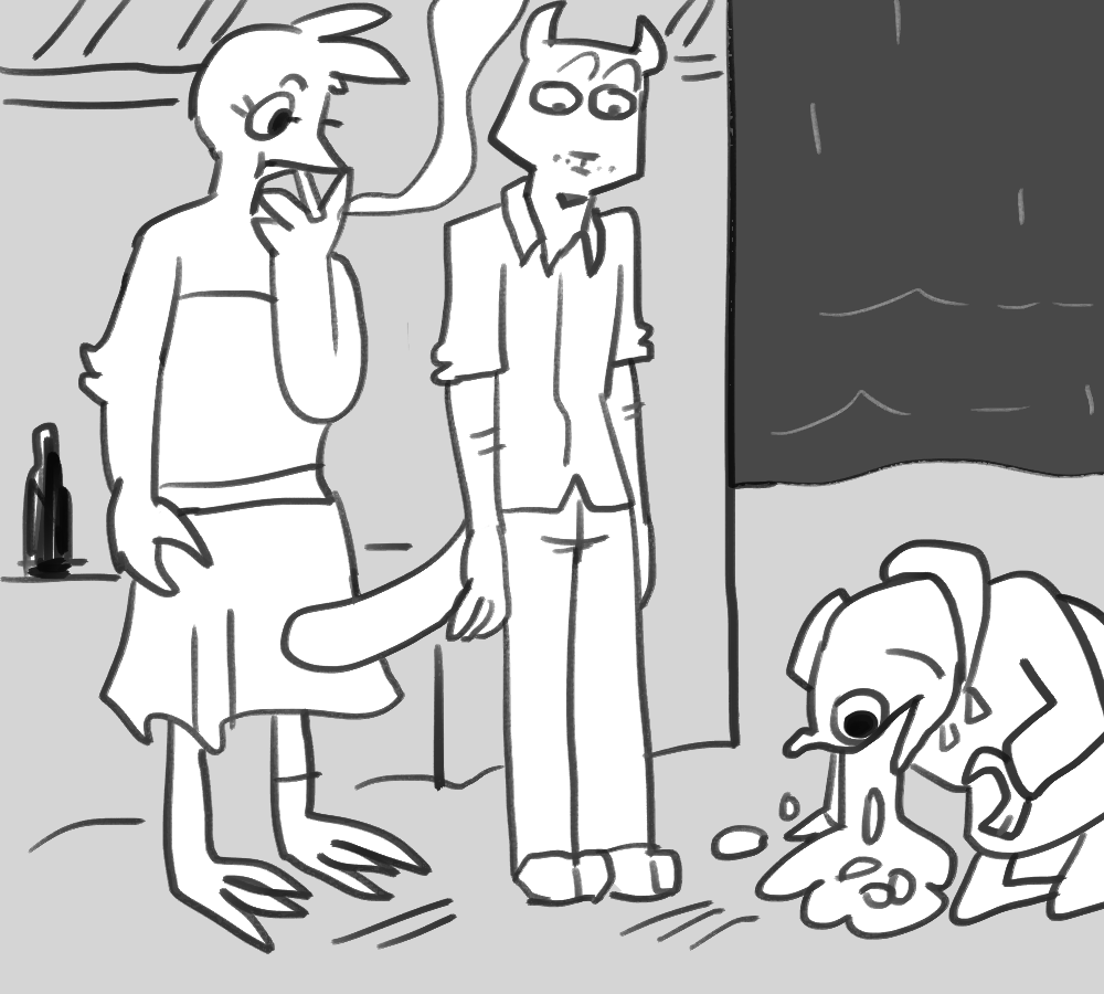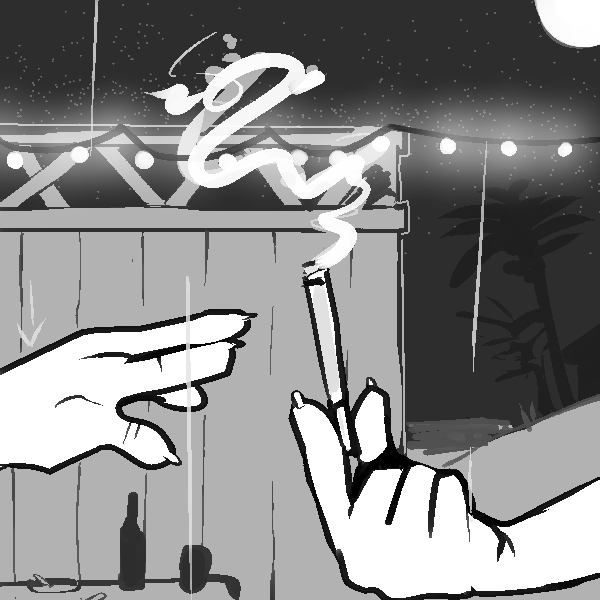 He stumbles away from the fire towards the nearest structure. It's starting to rain. There's a cat and a bird sharing a smoke at a cozy pavilion and Sal throws up in the sand at their feet.