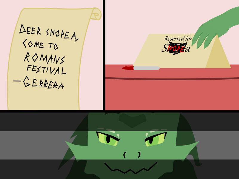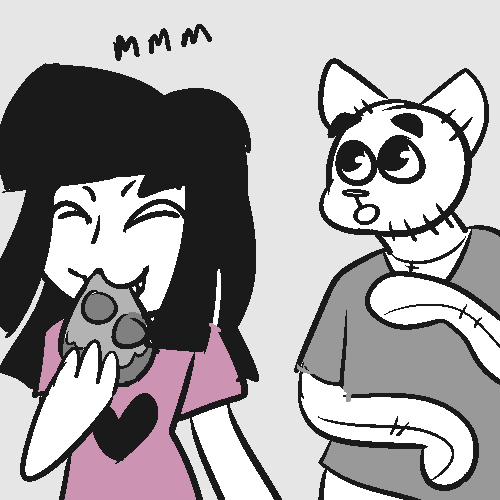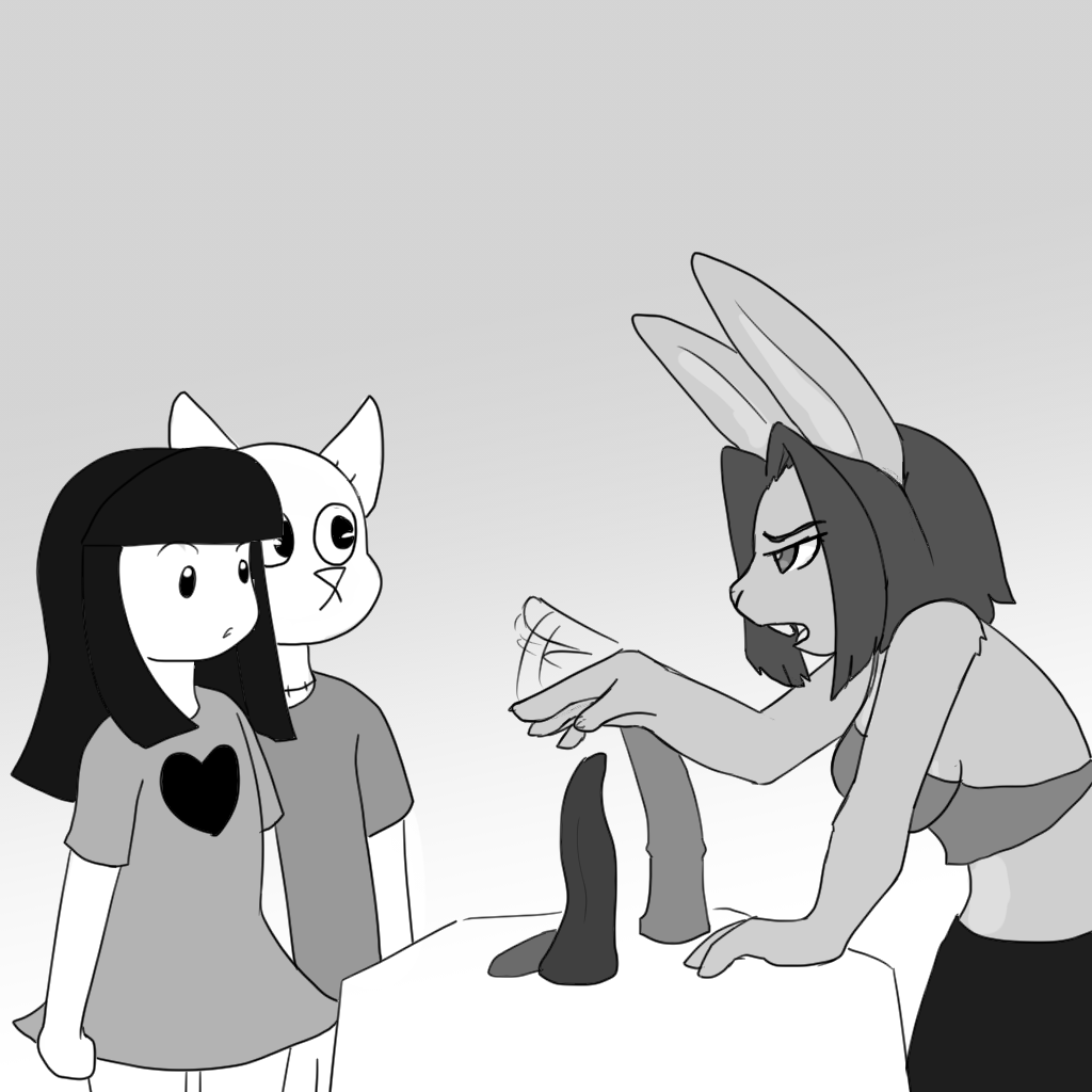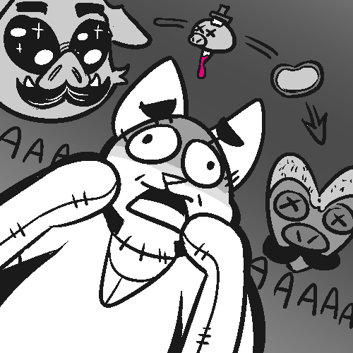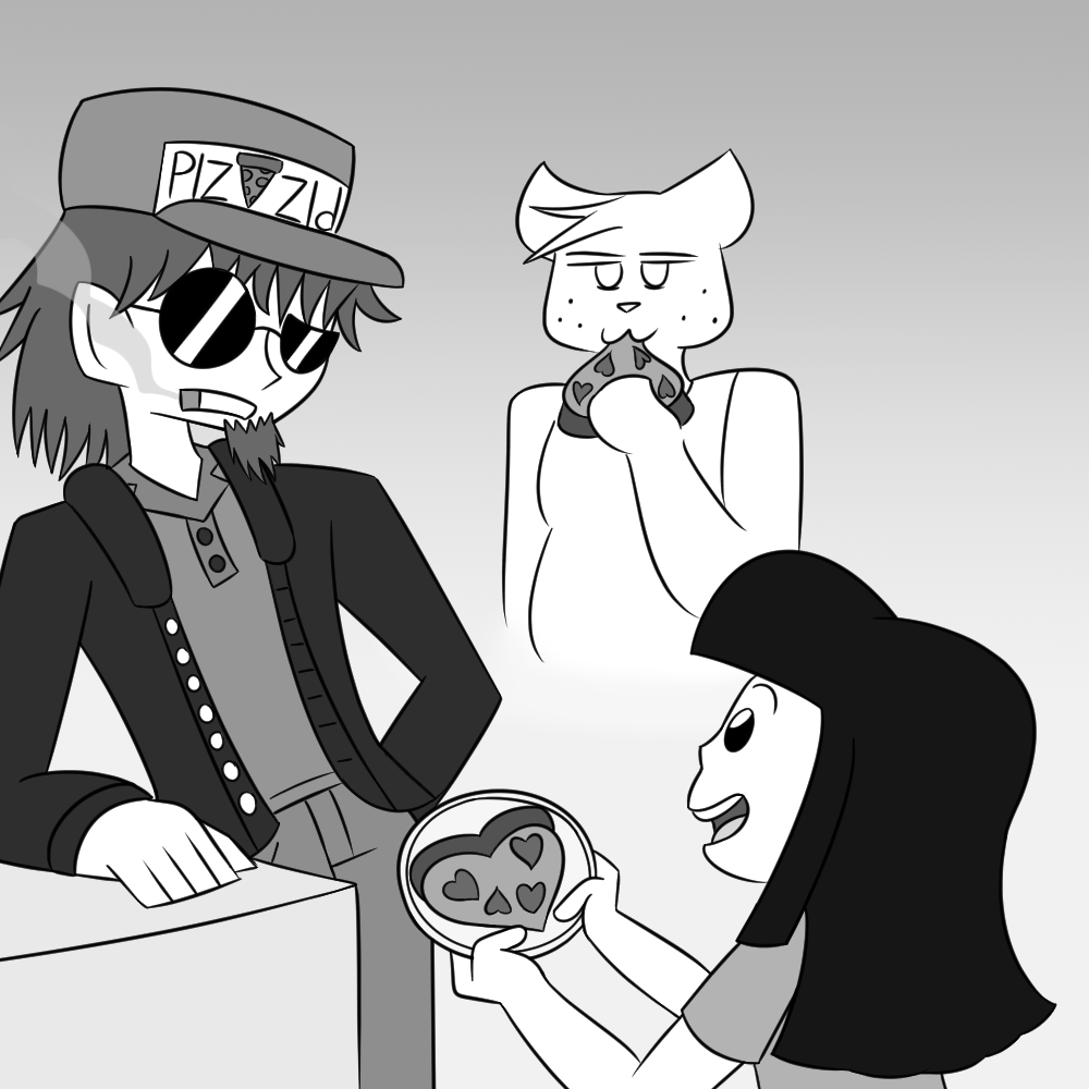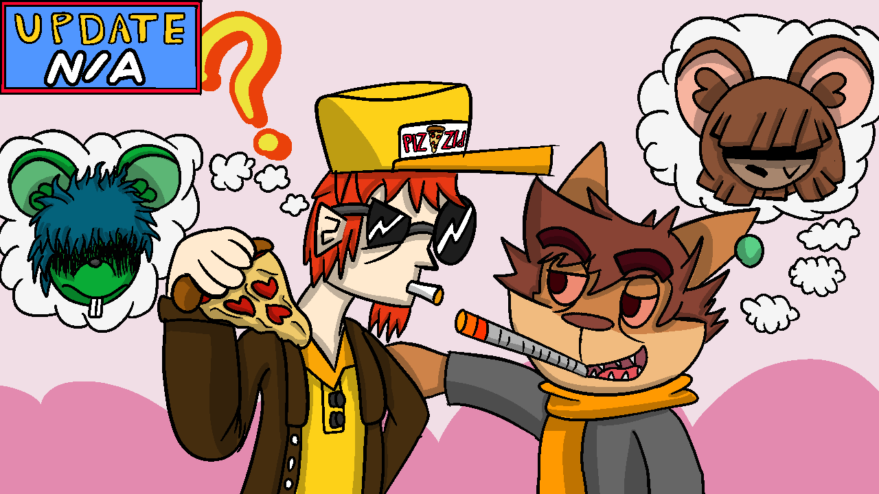 However, when he turns to hand over the pizza, he quickly pulls it away out of reach and takes a hard look to analyze the guest. He recognizes this cat. Didn’t he already serve this one as his first customer? Although the clothing is different, Jerry recognizes the pointy fluffy cheeks, the big cat ears, the similar hairstyle, signs of being baked in his eyes… Yeah, no doubt about it, this guy is trying to trick Jerry into giving him another free pizza with his disguise. Jerry tells the customer that is only allowing one pizza per guest during this festival, and if he wants more, he should contact the pizzeria at Crust City in Jerry's world to request expanding their chain to their world or something by giving him the coordinates to their universe.