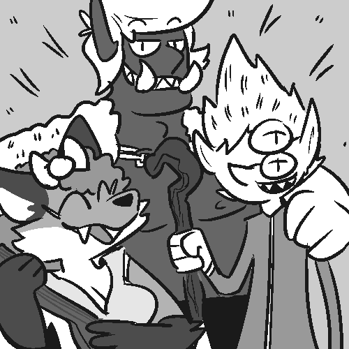 To their side is a short Fox-Kin woman, Dotticus the Flame, she has long eyelashes and is fiddling with a lute, humming a tune as they speak. They begin to weave their tale, inviting you into their motley crew.