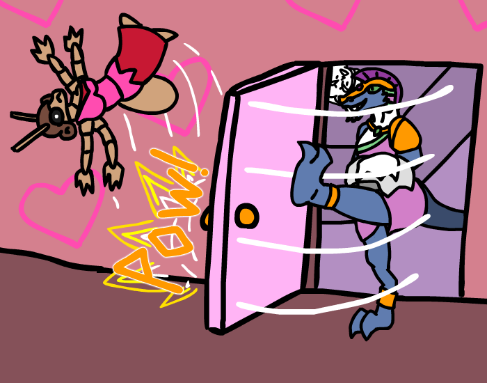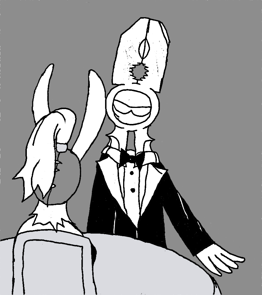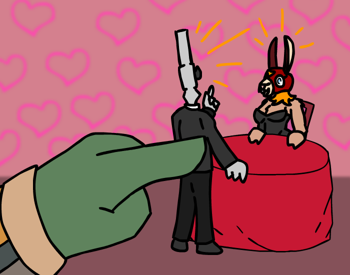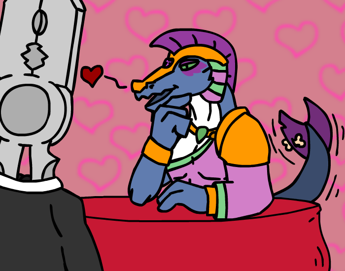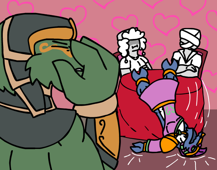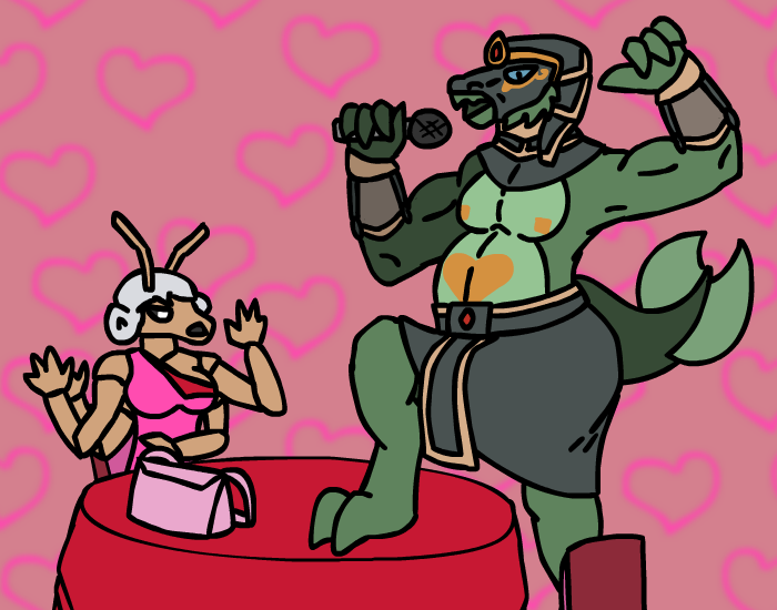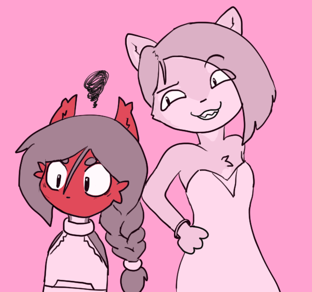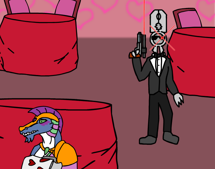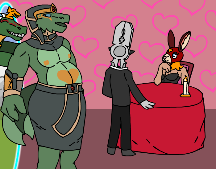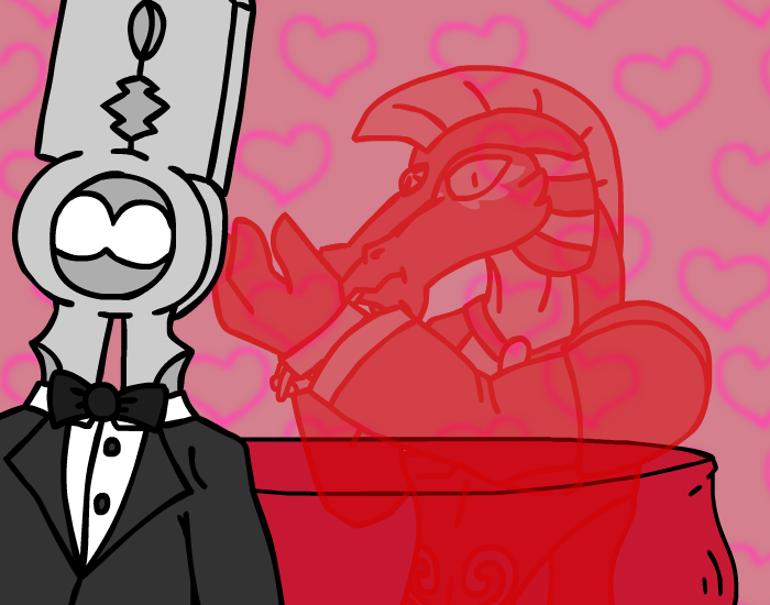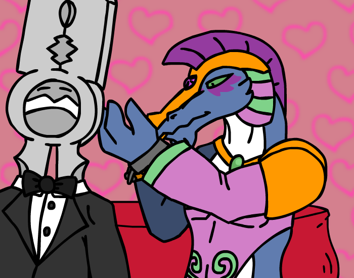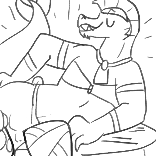 The two completely normal guys turn away and hold counsel, whispering between themselves while the Volin lays down in front of them in what he assumes is a sexy pose, only breaking it to clean his nails a bit. It only takes a few moments before one of the guys stammers out,
