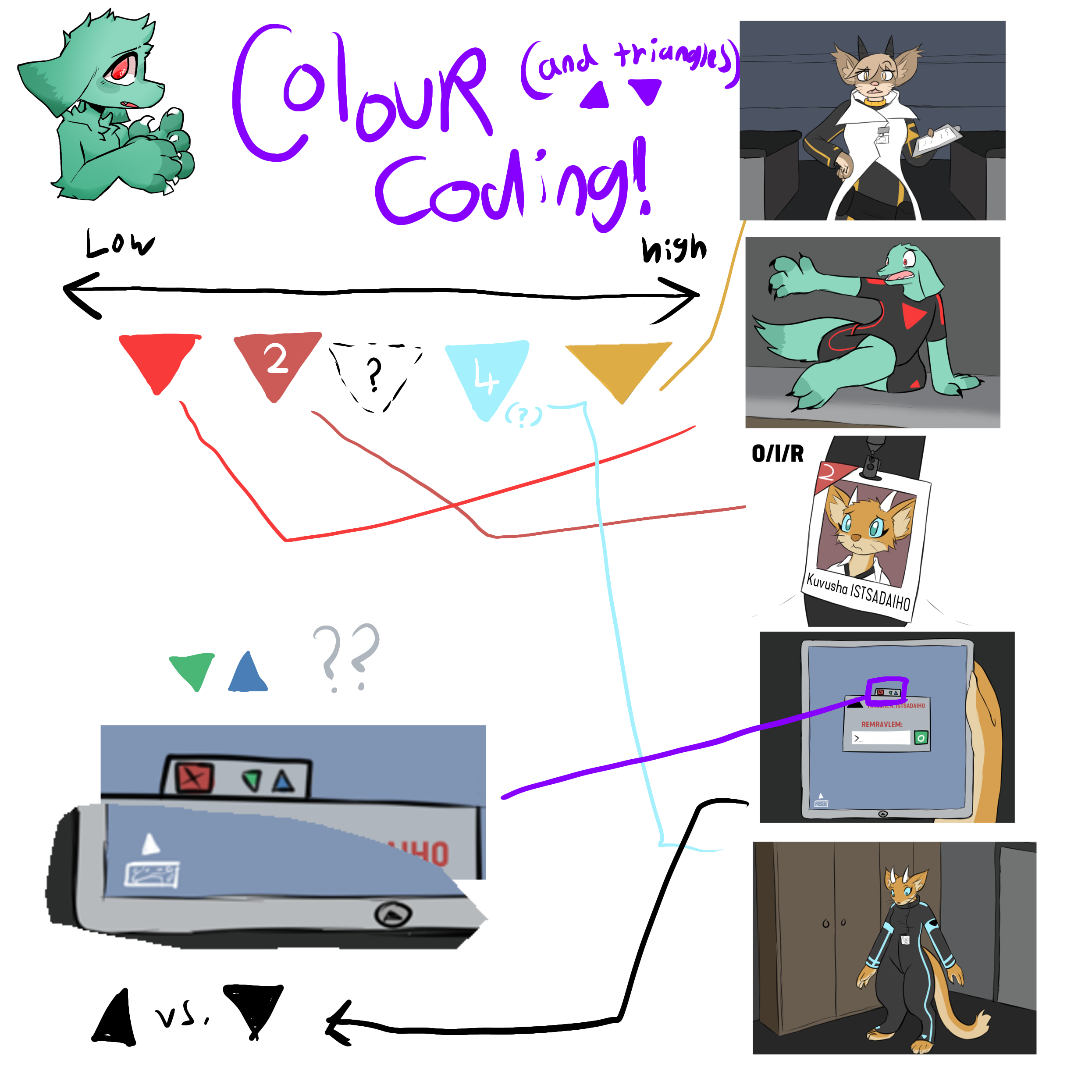 Moving on, the colours. So far, the only immediately obvious colours are the blue for Kuvusha, the red for Orro, and the yellow-orange for Ontinaz. My current theory is that this relates to the clearance levels that ontinaz mentions to Kuvusha in the very start of the quest. Specifically, she mentions that Kuvusha's current clearance level is two, and she says that that's a mistake, and that it should really be four or higher. Interestingly, if you look at the lanyard shown in the first panel, you'll see a desaturated red colour with a '2' on it. This leads me to believe that this desaturated red represents level two, and that the blue on Kuvusha's uniform represents any level of clearance above or including four. Ontinaz's yellow doesn't have any number I could readily assign but we can pretty safely assume that it's at least one tier higher than two since Kuvusha says that she's her supervisor. Also, going back to the tablet, you can see that there are two weird little triangles with colours we haven't seen yet. Whilst I initally thought that these could be represntative of clearance levels one and two, that wouldn't align with the desaturated red on Kuvusha's lanyard. That said, there could be some significance here given that one of them is inverted. Could just be I'm looking into it too deep... /shrug