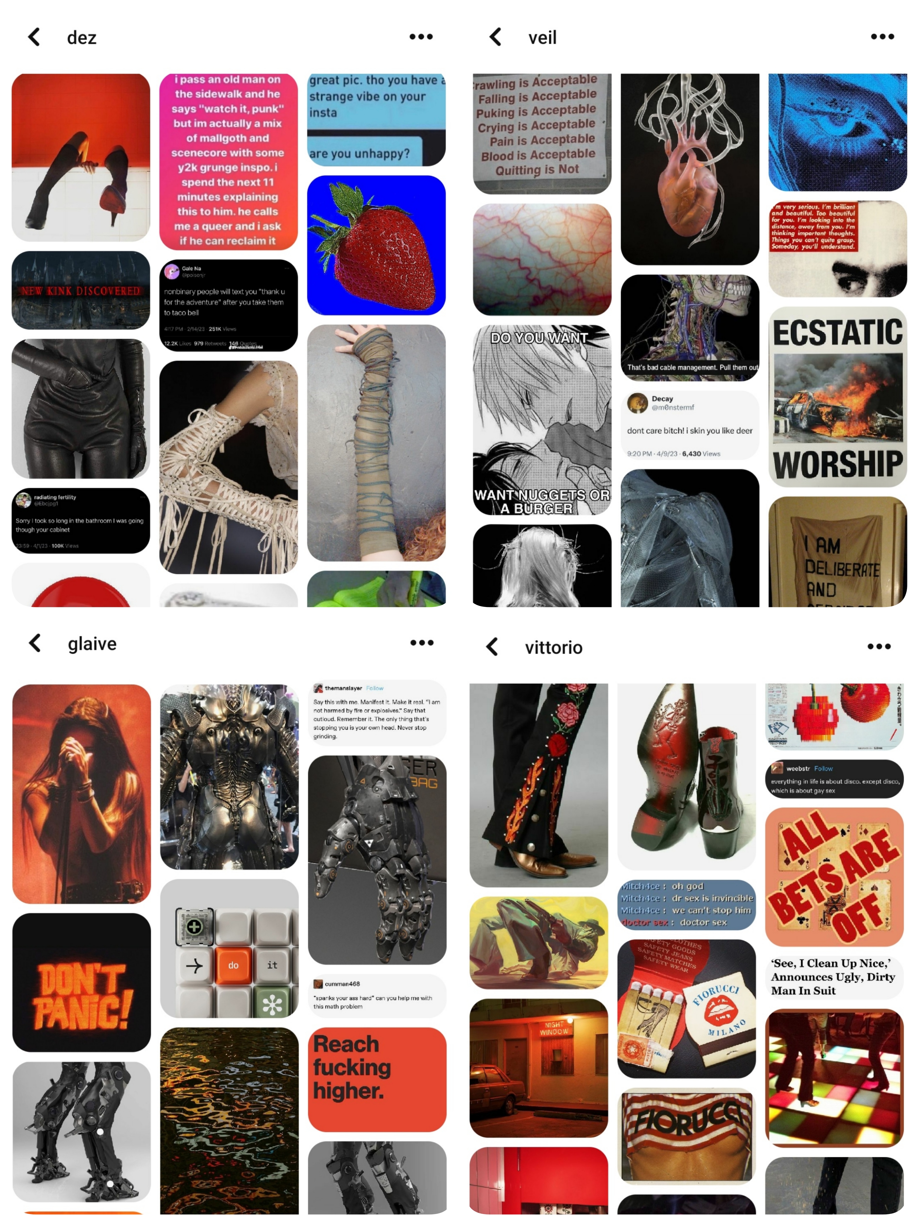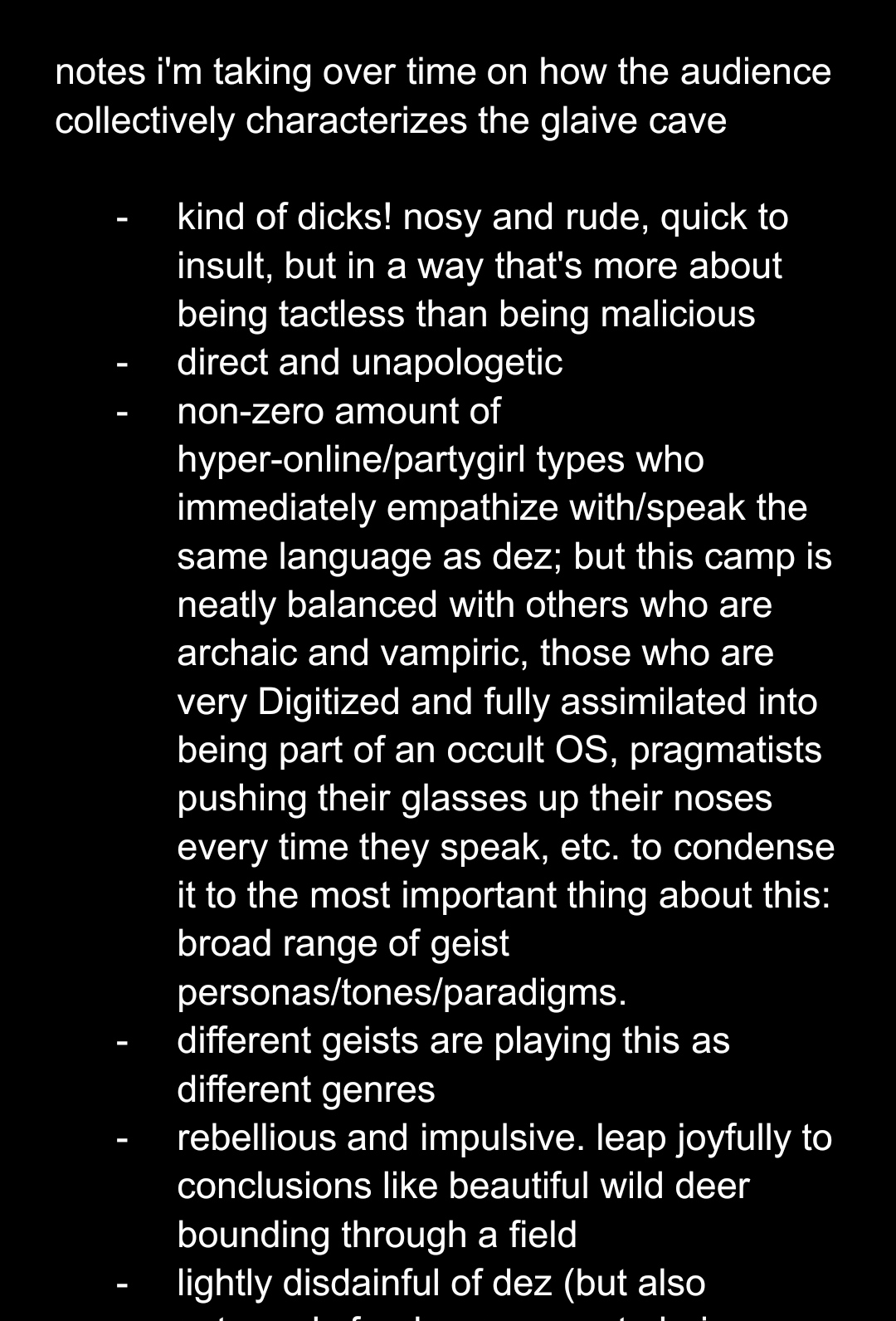 as for dez's day job: they have several! their most reliable/best paying one is helping out at their friend's bespoke fetish gear atelier, but predictably that's also the one that offers the least hours, and the rest of the time they are a thrall of the gig economy (they refuse to monetize their blog). none of this is enough to maintain their lifestyle of different outfits every night and 14 buck cocktails