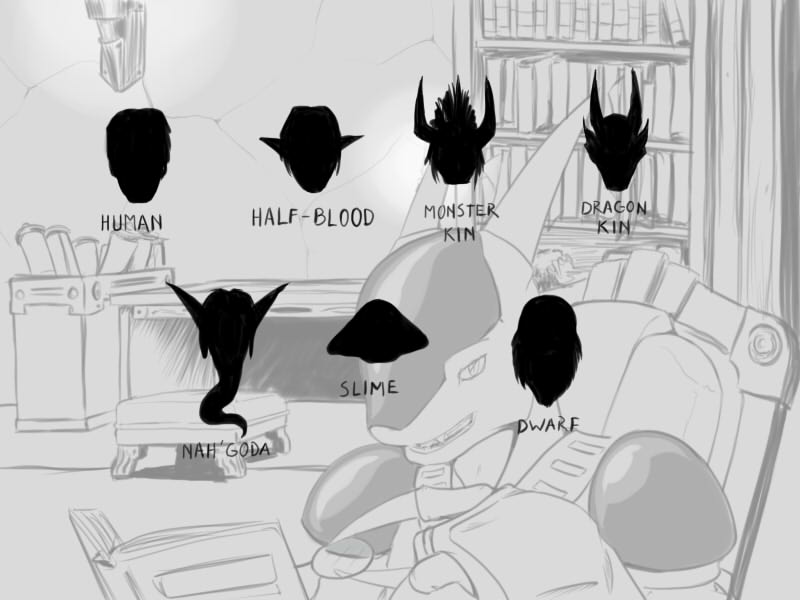 The Slimes were initially considered just mindless beasts that inhabited swamps and dank caverns. Roughly two centuries ago, the Slimes gathered together and came forth, demanding rights, and to be treated as equals to the other sentient races. Slime society is ruled by the Masked Slimes, massive aggregate slimes that wear a skull or similar mask representing a "permanent" head. Slimes reproduce by combining with another slime with desirable traits or genetics. The two then begin to divide into offspring. The parents are lost in the process, but their memories and personality traits are passed down into their offspring.