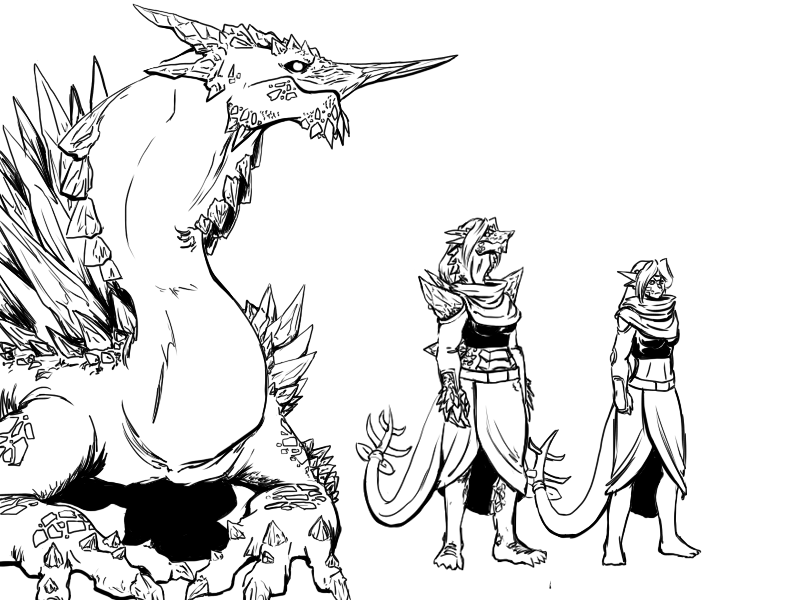 During the time of the War of Creation, the Elemental Masters commissioned the Dragon God siblings to create for them powerful generals to lead their armies. These generals would eventually come to be named Dragons. Each Dragon God sibling made designed dragons for two of the elemental masters, placing their own personal spin on their designs. Kelthulak created the serpentine Water and Shadow dragons, Goratesh designed the massive Lunar, and solid Earth dragons, Apudis designed the chitinous Fire and thunderous Storm dragons, and Nupsung designed the brilliant Light and the singular Time dragon. When the Siblings sought to prove themselves better than the Lord of Creation, they made followers. We were the first, but ultimately deemed a failed experiment by the siblings. They sought to create another race of worshipers while simultaneously showing up the Lord of Creation at his own game. They used their creations, the dragons, as a jumping off point and, much in the same way as the Lord of Creation did with Monster-kin, reshaped them into more humanoid forms. These Dragon-kin as they called them could shift between a more draconic form and a more humanoid form which even more closely resembled humans than many of the monster-kin.