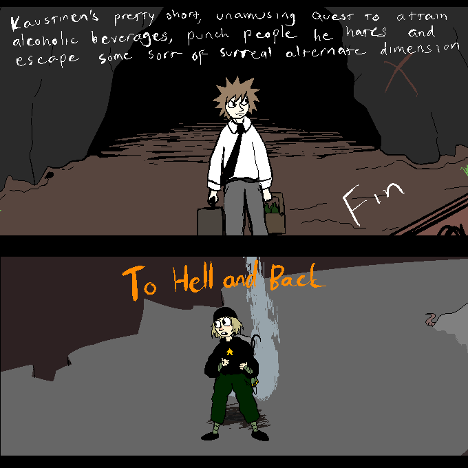 Also, on other news, I just finished that long-named quest, Kaustinen's Pretty Short, Unamusing Quest to Attain Alcoholic Beverages, Punch People He Hates and Escape Some Sort of Surreal Alternate Dimension. I would like some thoughts on it. It wasn't anything too serious, but more of a time-killer.