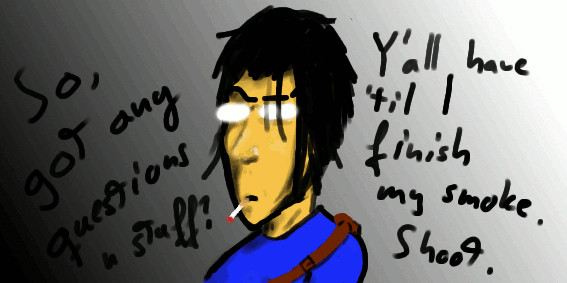 Laloth's easy to get along with. I don't think any of us dislike him, although he's completely impossible to rely on. But he'll go along with anything, and he's good to watch the store, and there's nobody better to just hang out with in a nice, inexpensive way.