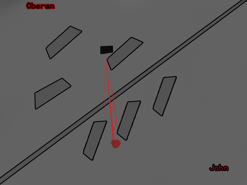 Clarification: When the shots were fired Oberan was moving to behind right cover and John was in the open between middle and left. The angle is as shown in the picture, with