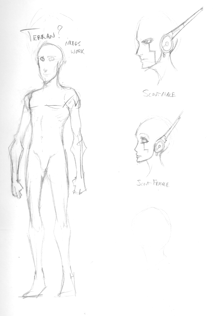 Pictured here is the stature of your average Terran. No, that's not exaggerated angles, the human form has changed in the indeterminately distant future. Centuries of industrial pollution and dependence on machines (as opposed to natural evolution) have rendered these neohumans frail, thin, and waiflike. The bone structure has become jagged and brittle, the muscles are less pronounced, and the senses dulled. Athletic neohumans are about on par with the average guy of today.