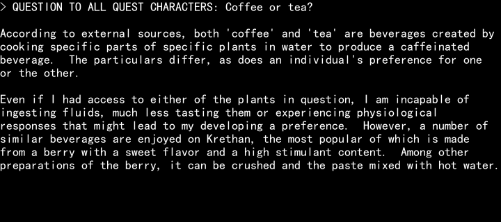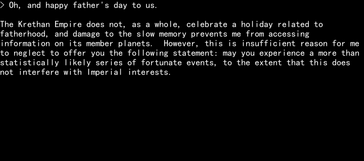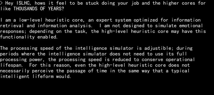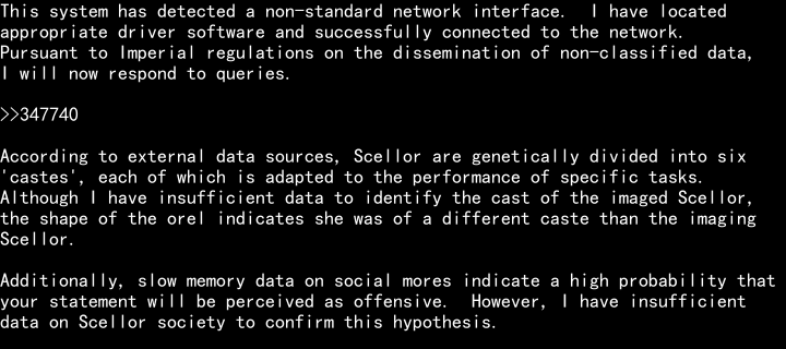 But we have a literal voice of our people that talks to us all the time. So, we just... never bothered much with culture. I mean, we make and do things that are pleasing to us, and we adapt our behaviours to our environments, and the other species we meet, but... well, it's all quite shallow, really. Almost all modern scellor who are interested in such things just enjoy and participate in alien cultures.