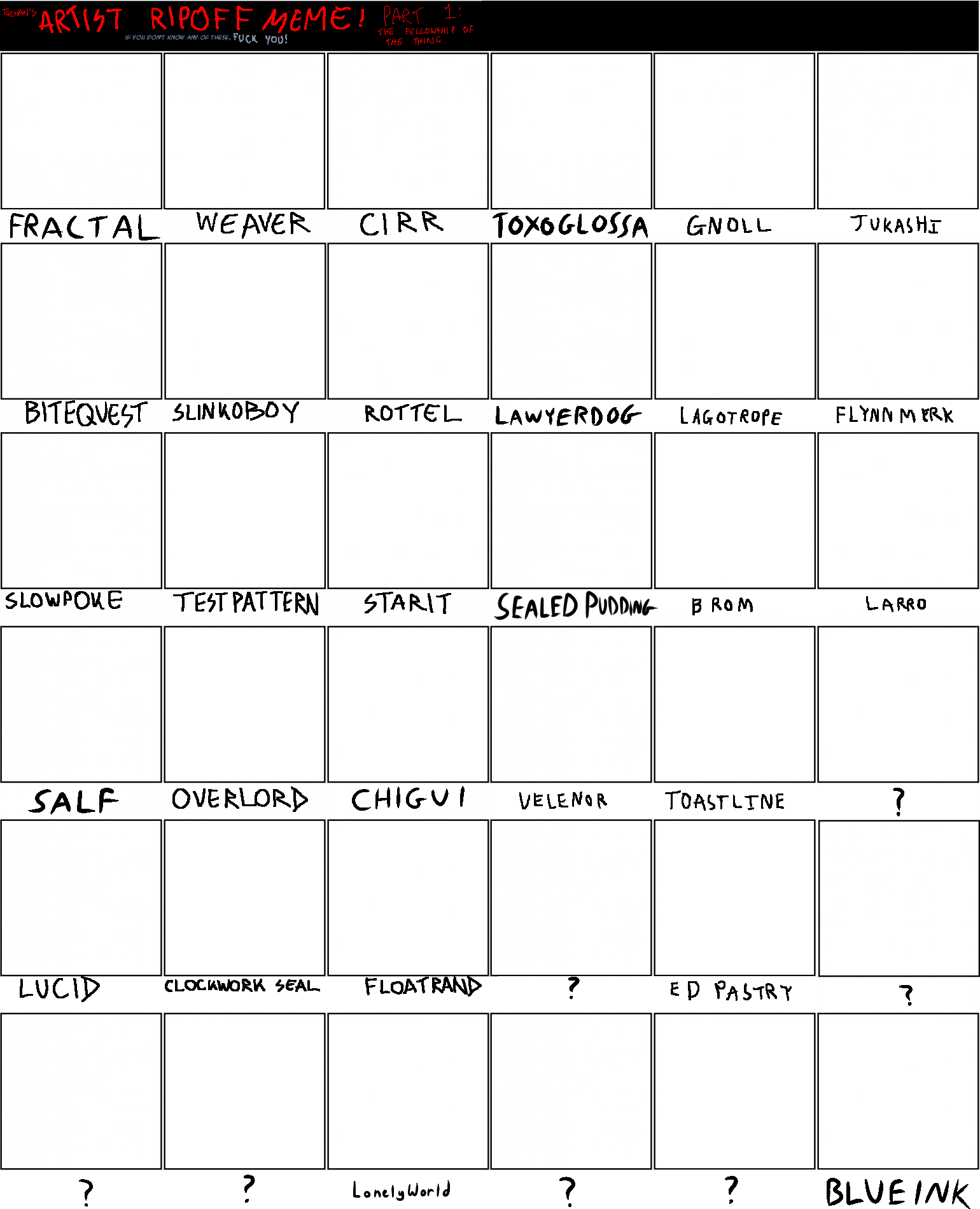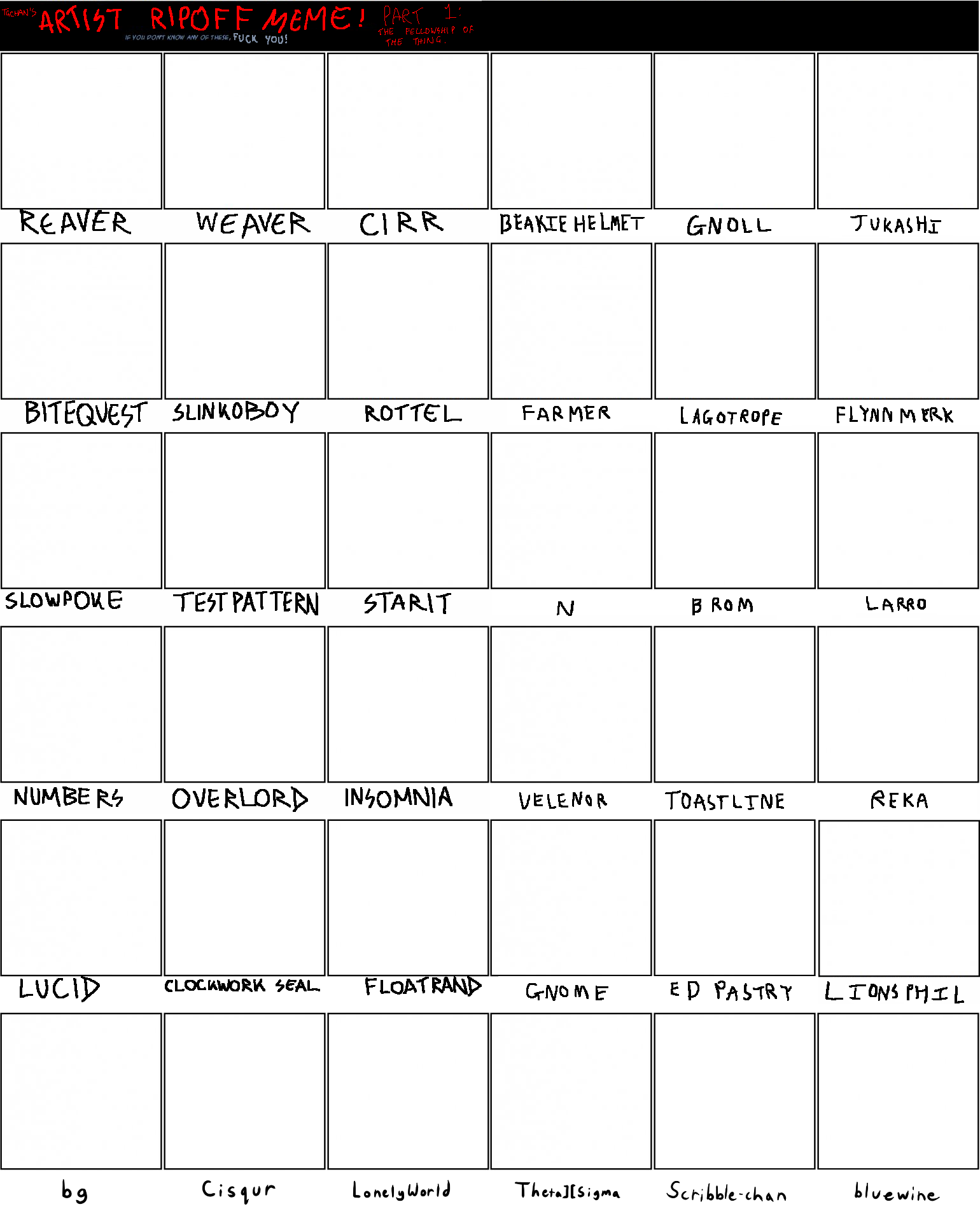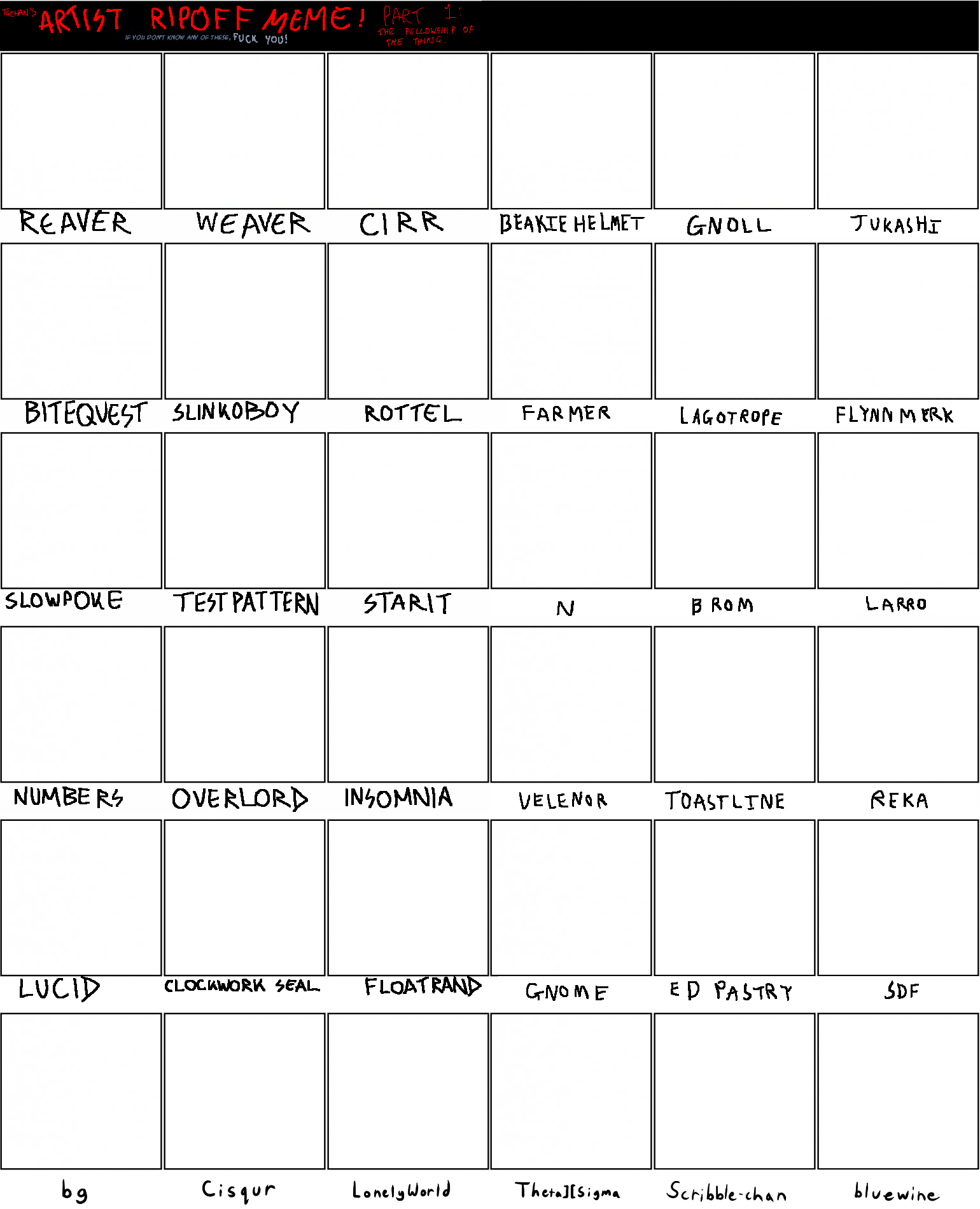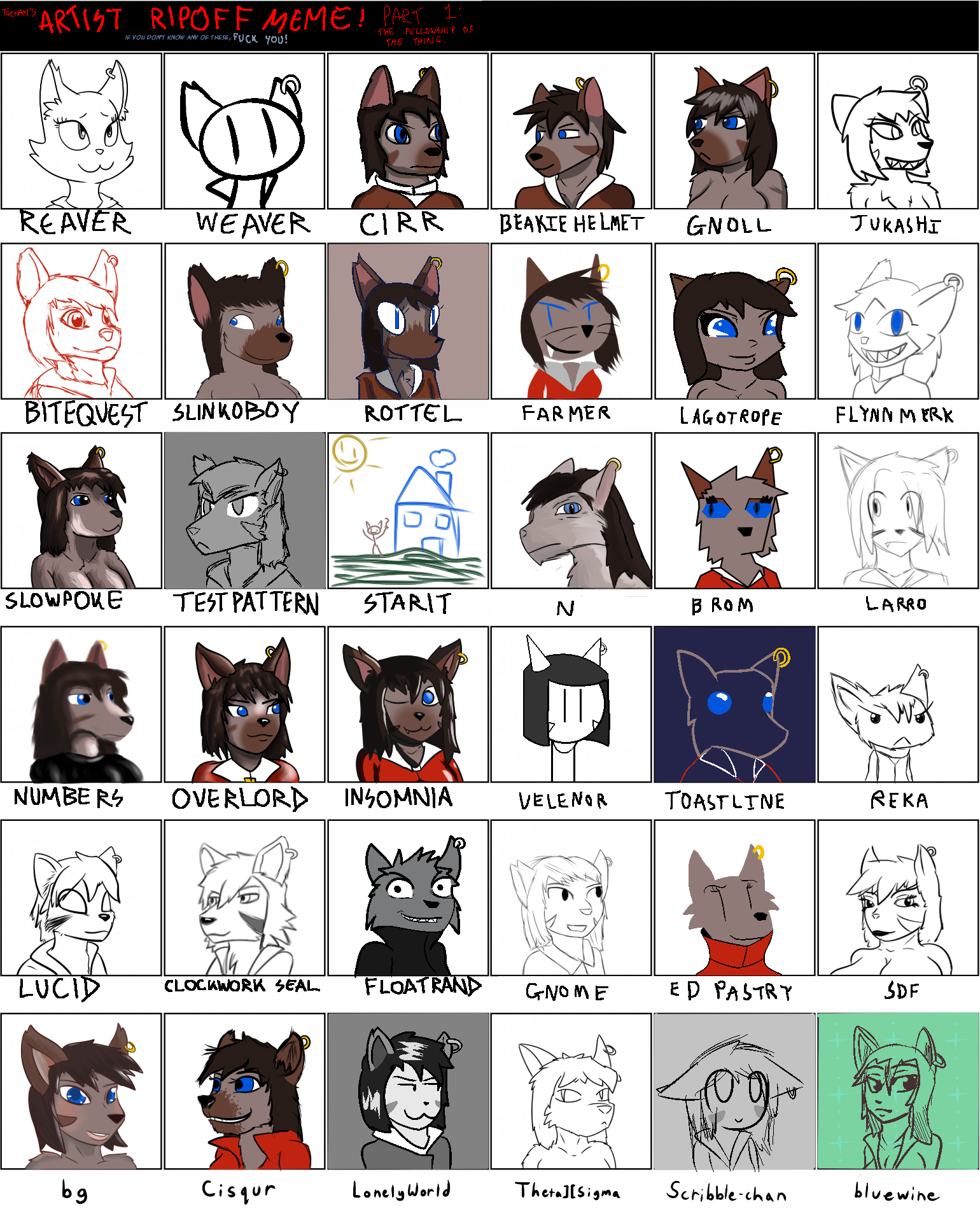 Reaver, Weaver, Cirr, Breakie Helmet, Gnoll, Jukashi, Bitequest, Slinkoboy, Rottel, Farmer, Lagotrope, Flynnmark, Slowpoke, Test Pattern, Starit, N, Brom, and Larro are all the artists behind it, so far, I think. Pretty sure it's just a comparison, not one person emulating everybody's styles?