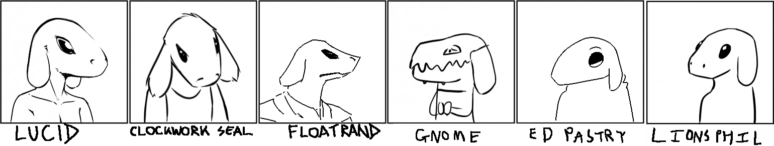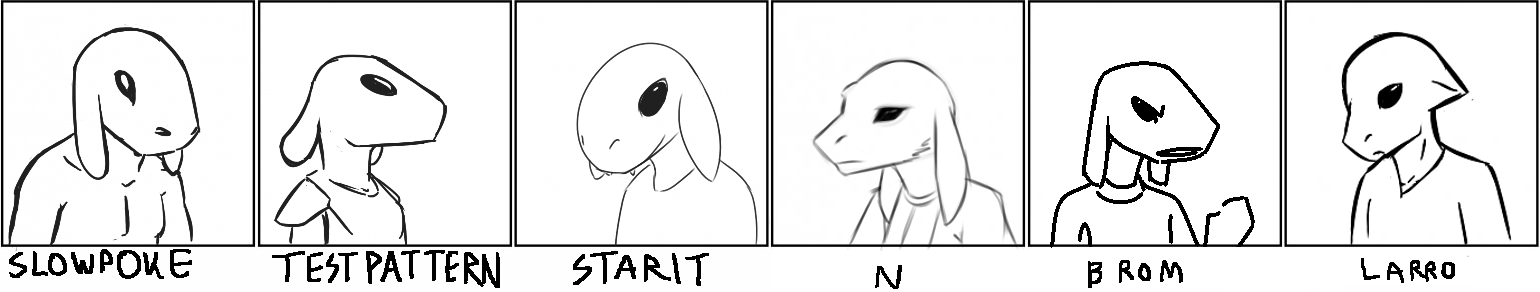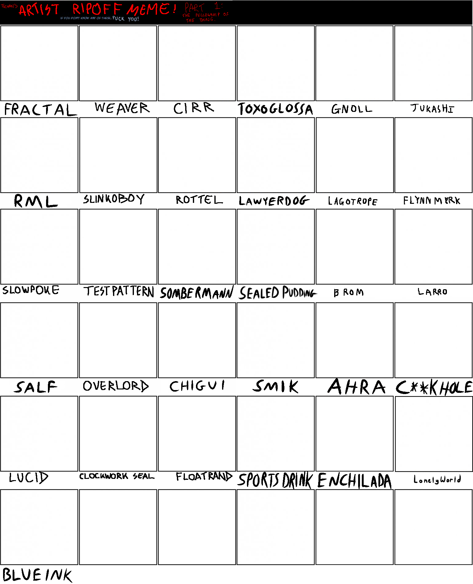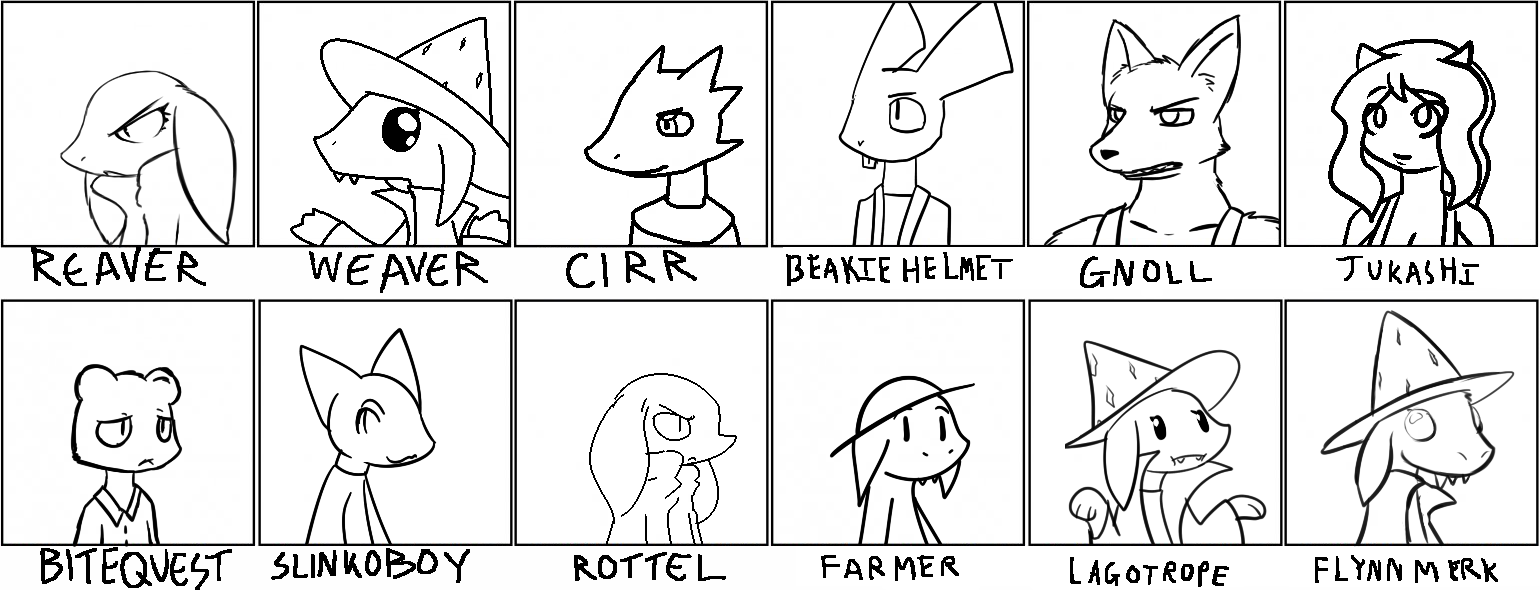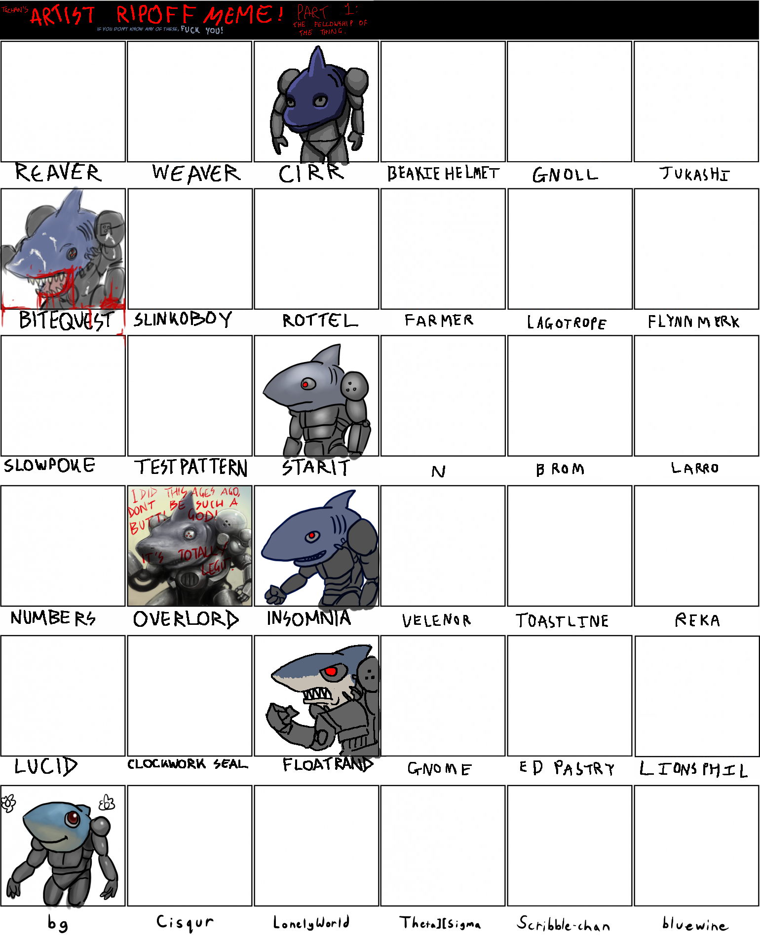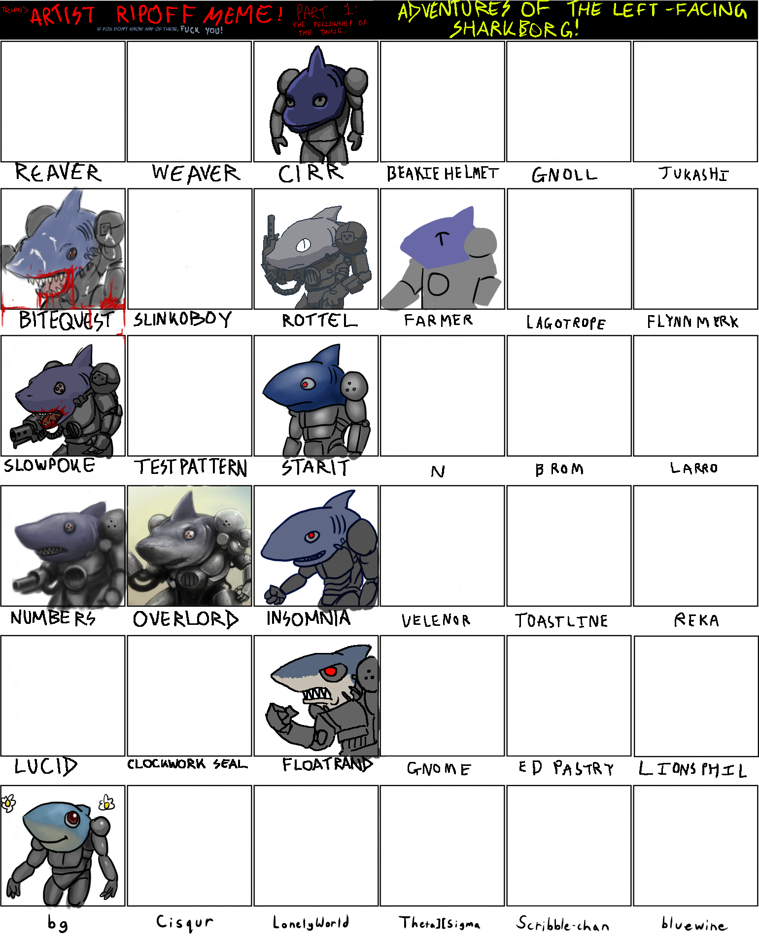 Reaver, Weaver, Cirr, Breakie Helmet, Gnoll, Jukashi, Bitequest, Slinkoboy, Rottel, Farmer, Lagotrope, Flynnmark, Slowpoke, Test Pattern, Starit, N, Brom, and Larro are all the artists behind it, so far, I think. Pretty sure it's just a comparison, not one person emulating everybody's styles?