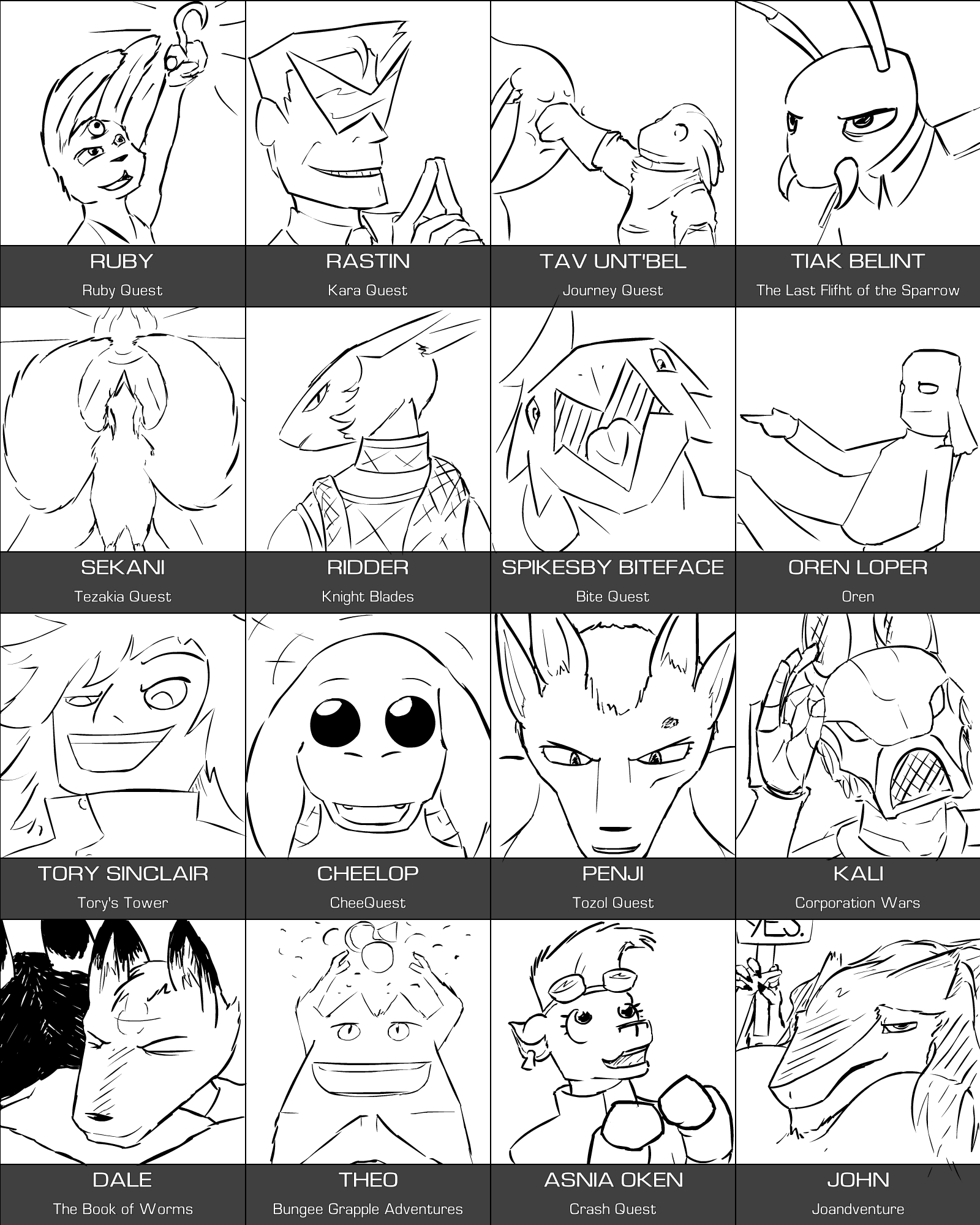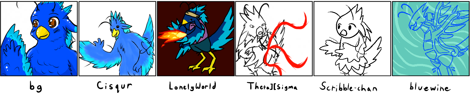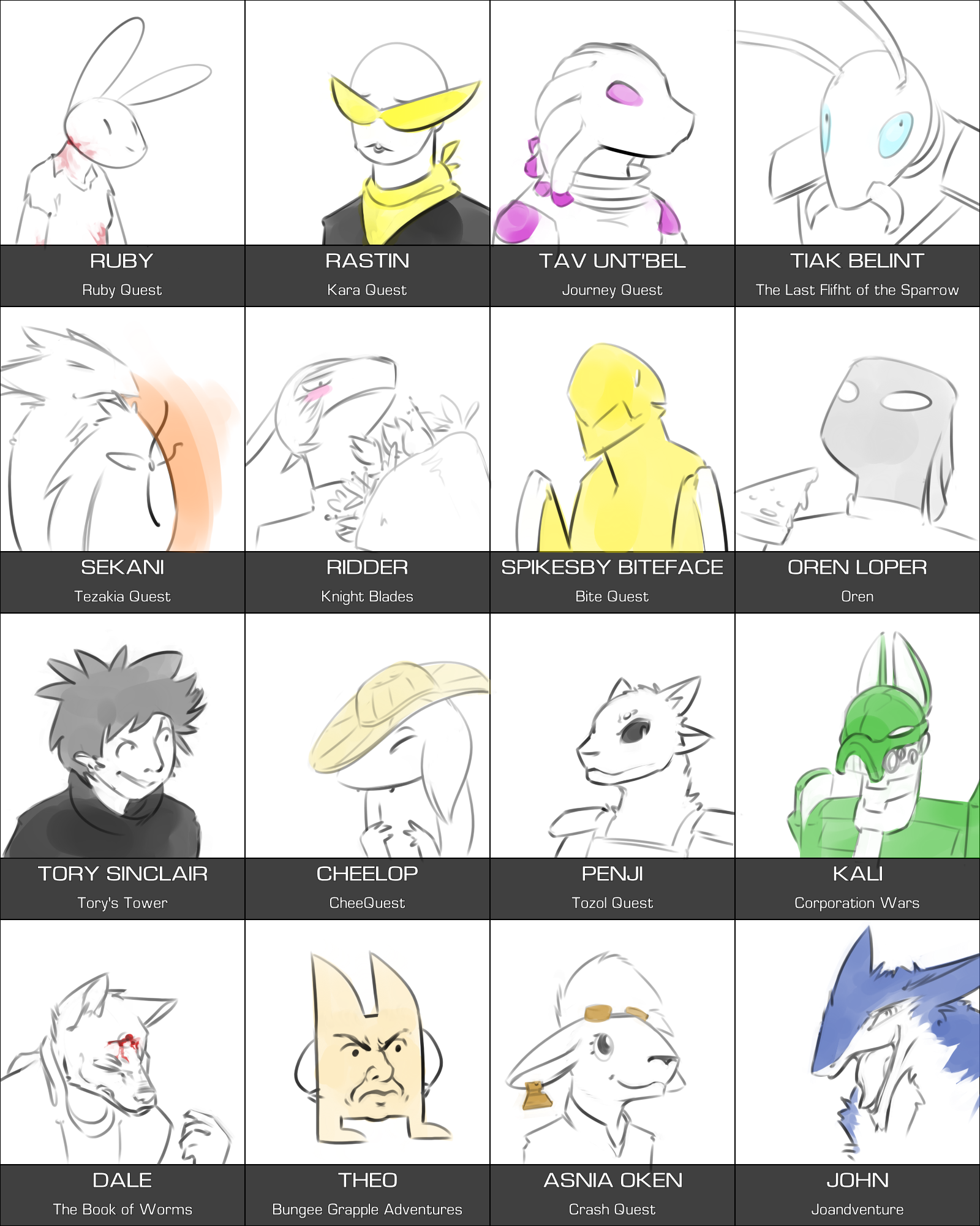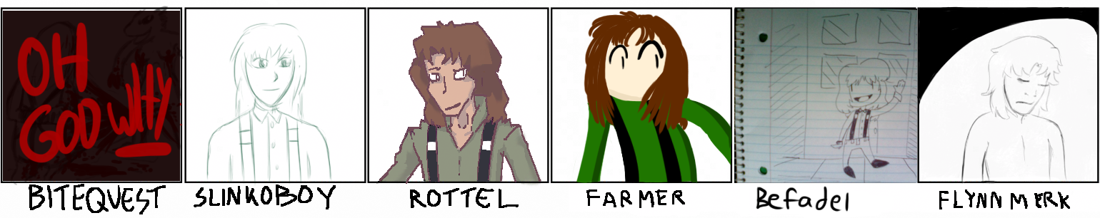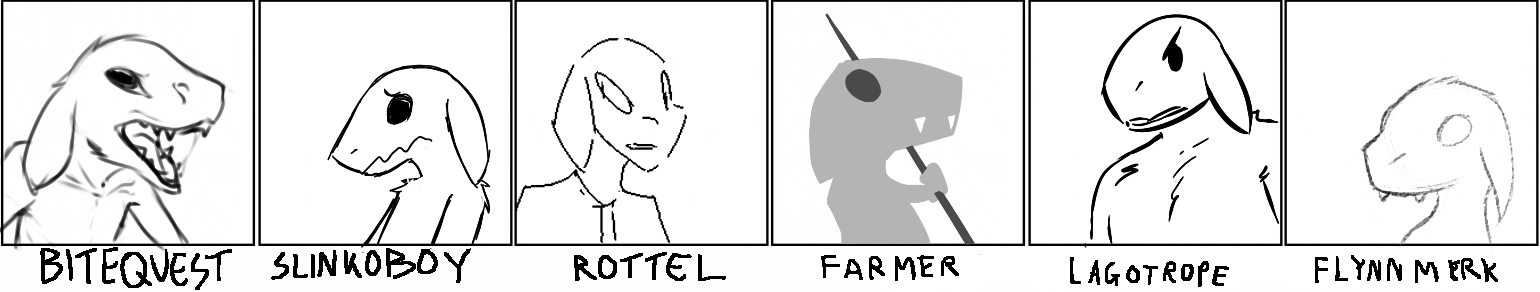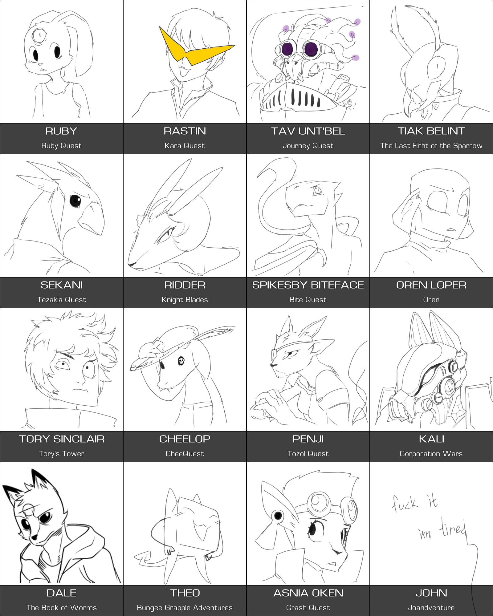 Reaver, Weaver, Cirr, Breakie Helmet, Gnoll, Jukashi, Bitequest, Slinkoboy, Rottel, Farmer, Lagotrope, Flynnmark, Slowpoke, Test Pattern, Starit, N, Brom, and Larro are all the artists behind it, so far, I think. Pretty sure it's just a comparison, not one person emulating everybody's styles?