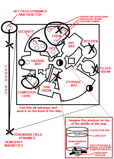 A pair of Yang clips, about a dozen circuit pins, exactlya dozen rubber washers, a portable fire-foam dispenser, two flatnotes, a water bottle, a velcro palm light, three Orlan spacesuits, one Mitsubishi spacesuit (30 minute air supply), Alice Weber's ID smartcard, an impressive variety of foodstuffs, the ship's hexa set, a pry bar, a battery powered cutter, a lifetime supply of zippers, a sealed bag made to look like a knot of zippers, a battery powered lantern.