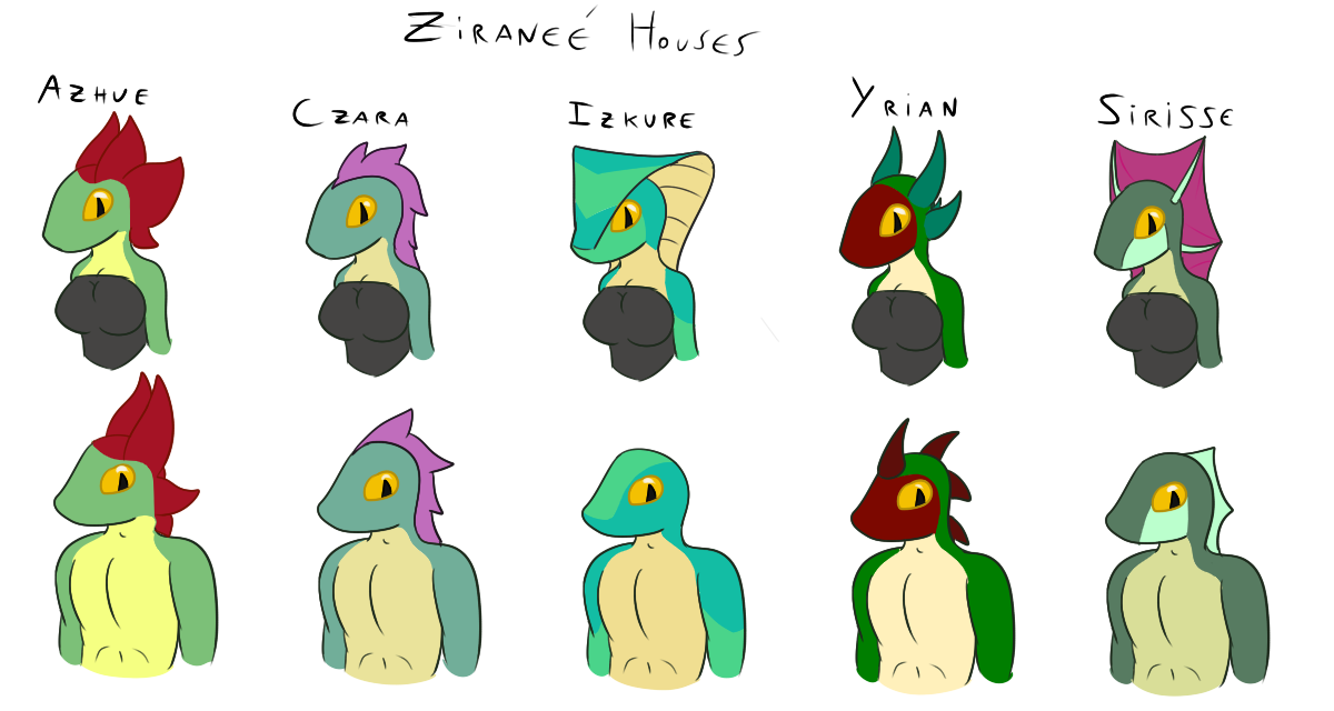 About differences in behavior and politics: They’re actually not really dependant on the House they belong to, but their Queen. Most Ziraneés are so loyal to their current queens that they’ll adapt to her way of thinking, points of views and politics. They’ll rarely openly question her, only in extreme cases. So, for example, during the reign of Lyra V’Azhue, most Azhue citizens followed her example, being pragmatic, resourceful and determined. For the same reason, right now the Yrian house is the most open to trades with other species and civilizations, they also tend to be more tolerant and hedonistic.