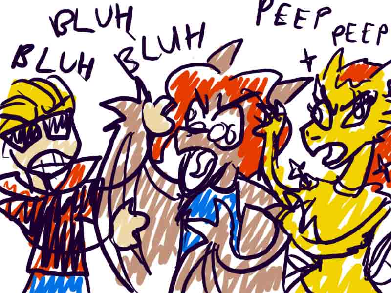 The three authors had their own quest-telling style that clashed a bit in places (especially the Ayaar prisoner - she seemed more like Mitzi than Piyerra, Radde, Maolla or even the Ayaar leader to me) but overall it made for a varied, interesting read. Jukashi's sections were funny, light-hearted and really showed off his characters. Radde's speech about saving the entire universe from entropy was great, and probably one of the best parts of the quest. LW's sections were dark, bloody and gritty, and it left the astranians feeling very... well, dark and bloody :p TP's sections were gloomy and gray, appropriate given the situations the Tozols found themselves in. They also, however, showed off his characters' ranges quite nicely and despite the gloomy atmosphere I never felt like they were completely hopeless.