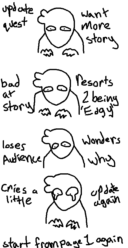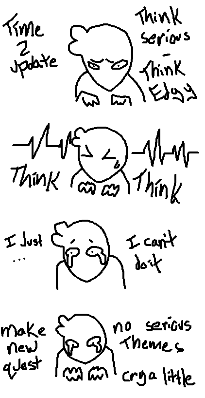 so yeah hey, it's me again. Remember that thing that I do, you know- the thing where I lose motivation in continuing a quest that i've started? Well the 7nth has caught that too now, i'm getting alot of work lately because my job is merging stores. These few weeks have been just me doing full week, six hour shifts with only one day off- and my next day off isn't until the 28th. Not only that, but I need to come up with an easier way to manage my expenses- i have gob awful sums of money but since we bought a trailer and need furniture I have to plan out my money and save a lot. Than there's... blugh... I want to do a webcomic someday, like an actual long term thing, but I don't seem to have the focus to do one.