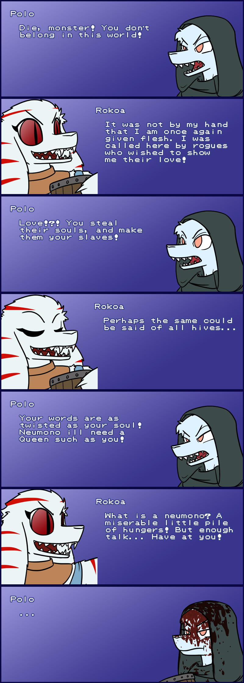 Originally when I was brainstorming for Rogue the story was going to be Luvi being kicked out of her hive and going on a quest to find a new hive. It was going to be a comedy, and be about the misadventures of a rogue trying to find the one in a million chance of the hive that's just right for her, growing along the way. Luvi still went on this quest in the current story but despite maturing she didn't grow. I do think there's a difference there.