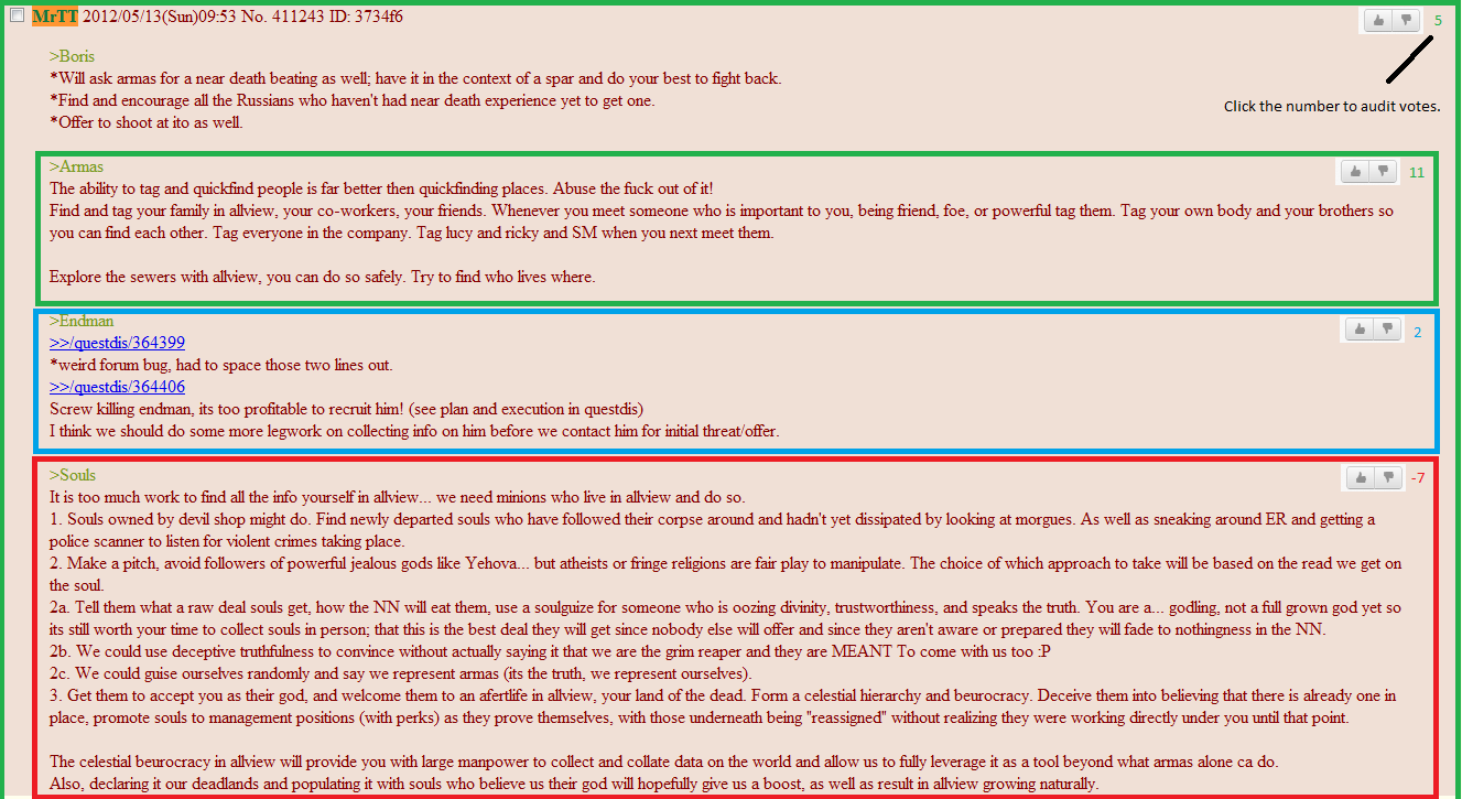 3). To prevent weird issues with Up/Down votes on old posts, there would need to be a way to "lock" them up to a certain point, essentially creating "voting cycles" under the administration of the quest author. This means that threads would require a mechanism for ownership, registered to an IP or tripcode.