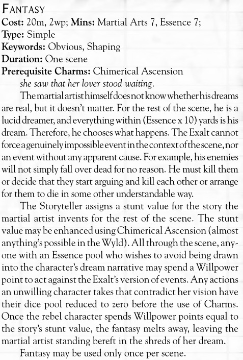 While their primary use in mortal eyes is the low-yield production of Gossamer - a service that Yuugin charge highly for - they can also weave webs to ward off nightmares, heal broken dreams, stabilize the mortally wounded until help arrives, crudely manipulate Fate, and - in extremis - darn socks. Sorcerers also value their ability to temporally isolate a volume of space, permitting some time-related tricks. Elder timespiders may assist with travel, moving a supplicant from one dream anchor to another physically.