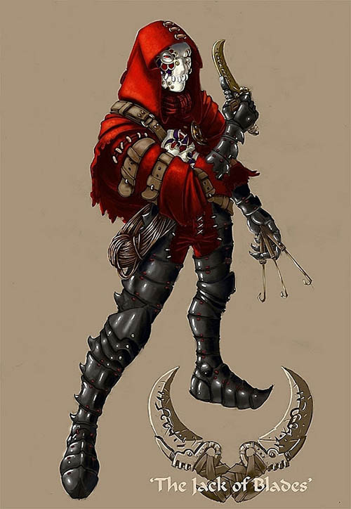 -Sable Executioner (HS: Luo of the Winding Path): Three Black Steel ribbons, each some twenty feet long, that take the place of Mordre's right forearm and hand. The ribbons are lined with fine saw teeth, and are subtly edged, with great cutting power. Each individual ribbon can be manipulated independently, and all three ribbons can be wrapped about to form a saw-toothed lance of coiled Black Steel ribbon some seven feet long (with upper arm included, total reach in this state is 13 feet, and uncoiled each ribbon has a range of 25 feet). When so wound, if the point of this coiled lance is placed against an object and forcefully unwound, it can act as a drill until such time it finishes uncoiling (3 seconds maximum, with shorter duration uncoiling having more intense drilling take place). Wounds caused by it have a high chance of infection, are prone to higher amounts of bleeding, and heal more slowly. The Black Steel ribbons are able to saw through hardened targets with sufficient force.