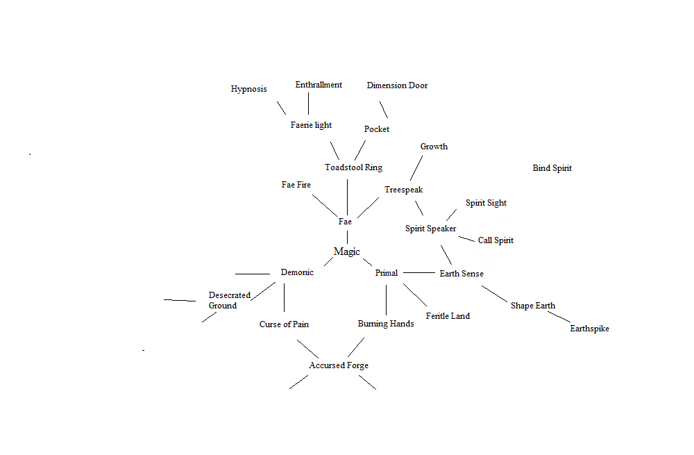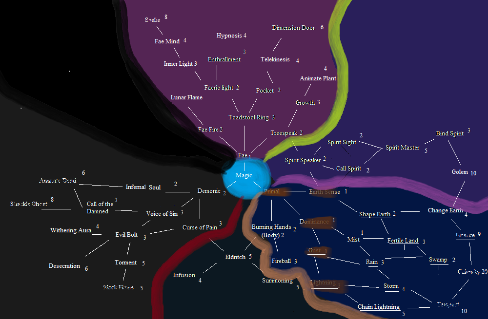 Fae/Demon would be controlled monster creation: combining Fae's animal manipulation with Demon's monster creation. Creation of werewolves, in other words. Also the creation of a Hell dimension (a special place for monsters, essentially, inimical to mortals), combining Fae land-creation with Demon desecration.