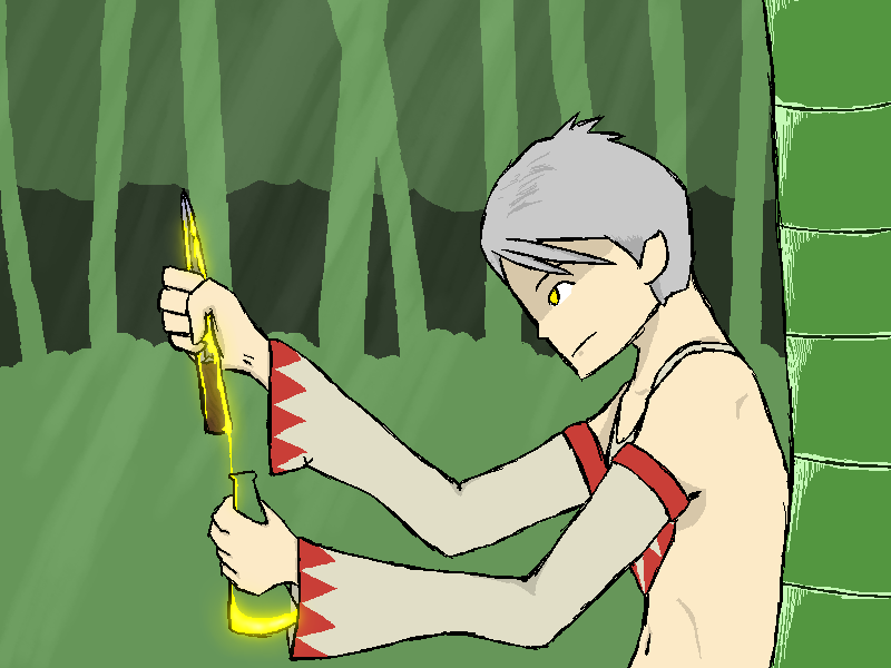 Most of the pictures here were drawn pre-quest. His original design was a combination of mokou and a white mage, hence the white and red color scheme. Now that there's a good chance we'll run into mokou, there'll be a bit more in the way of customization to give Rayne a bit more uniqueness/character.