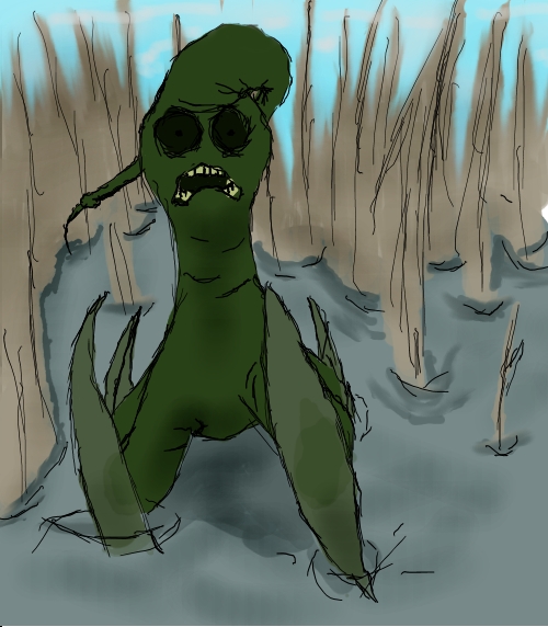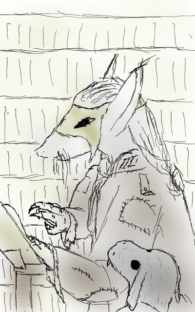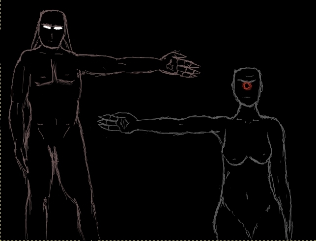 Female, late adolescence, notable contrast to male in having a singular discolored eye, as well as lacking the large ears of the male. Scans show massively deformed skull and brain structure to allow for this eye and even cursory examination reveals crude scars where the ears would be (female circumcision? occult sign? criminal penalty?)