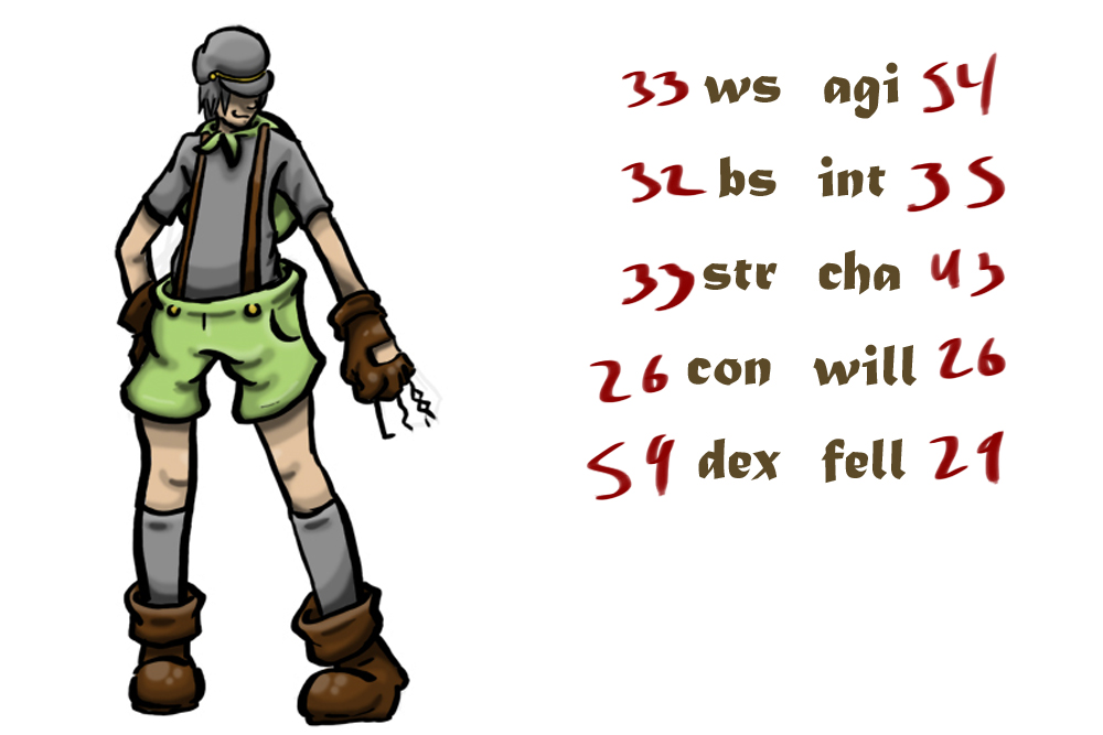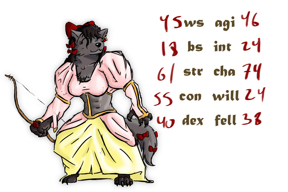 Her immense strength permits her to lift over 300 pounds above her head and her dwarven resilience permits her to resist crashing blunt weapons or the stomping feet of monsters... she's not one to be crushed in bed... piecing and slashing attacks cut her however... her modified internal organs grant her near endless stamina, held breath for over and hour, night vision, thermal vision, limited invisibility, temporary hemorrhage cease flow, near invulnerability to poisons, adrenaline dosses on command, can go several days without sleep depression...