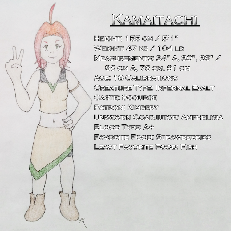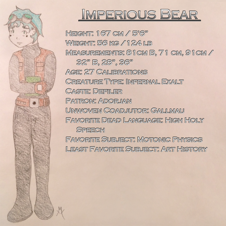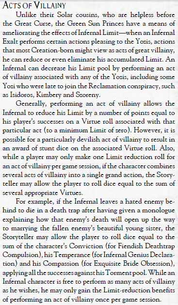 "Well, obviously, I know a lot about the Infernal Exalted, but that's because I am one. I should probably also mention the Akuma, which are a different kind of Infernal. See, sometimes a Solar gets really, really fucked over and gets desperate enough to ask the Yozis for help, and the Yozis say yes, and then the Solar's soul gets eaten and they become a demon, basically. In short, they're kind of like a piece of the Yozis themselves, just like any other demon. They're a bit too much like animals to really be considered people, since they can't really think for themselves, and they always have to obey their Urge. Honestly, they creep me out. Oh, and you don't have to be a Solar to be an Akuma - any kind of Exalted can do it. Except maybe Deathknights? I don't know - I've never seen a Deathknight Akuma before.