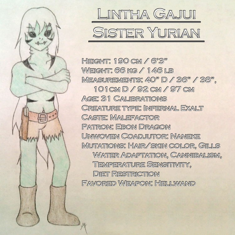 "The Lunar Exalted were made to help the Solar Exalted. They can turn into animals, and people, and probably plants and rocks or some shit. They usually have Moonsilver tattoos, but they can hide them. They mostly keep to themselves at the edges of Creation. I've heard a rumor that each Lunar was bonded to a particular Solar Exaltation, so that means that, even after all the shit the Yozis did, that bond might still be a thing! I doubt the Lunars would be happy about that, though, once they found out about the whole Infernal-ness. But, still, it's a nice idea, thinking there's one person out there in all the world who is literally meant to be your partner. *sigh~*
