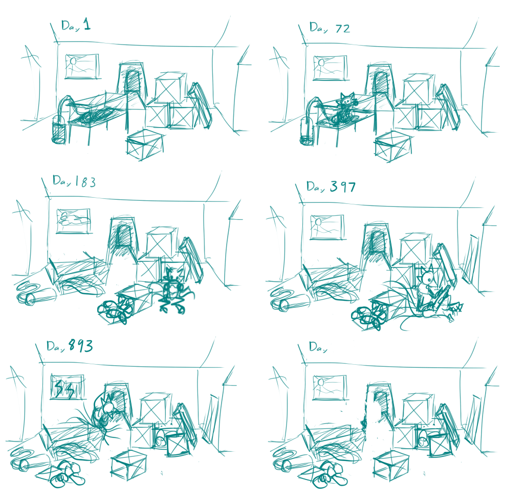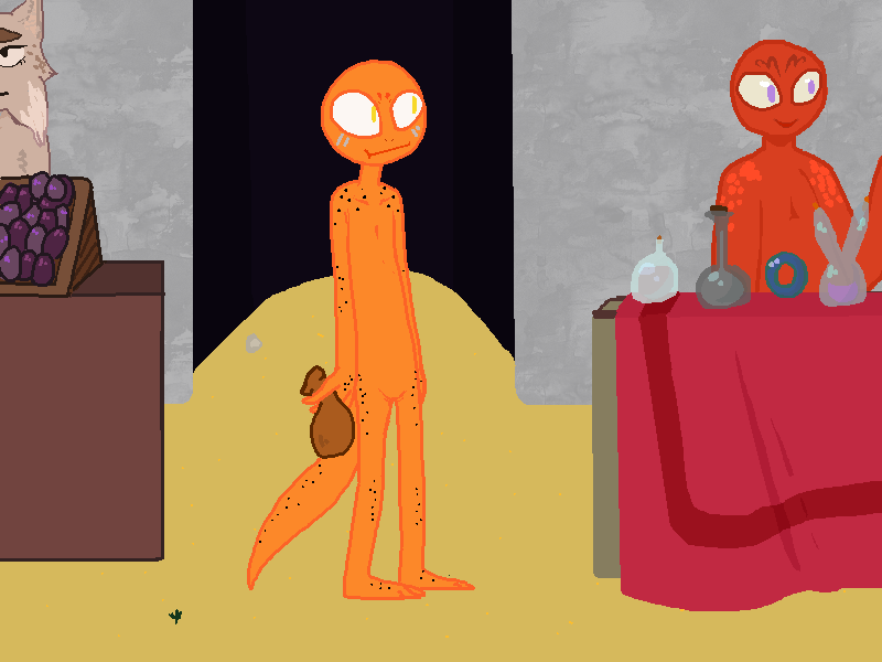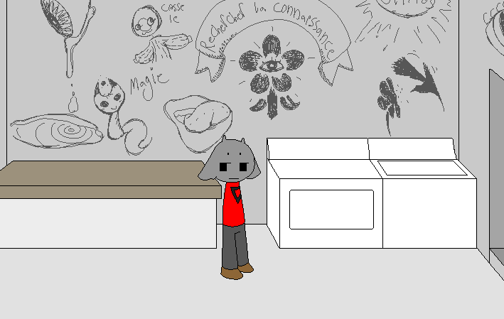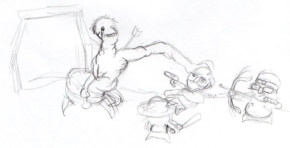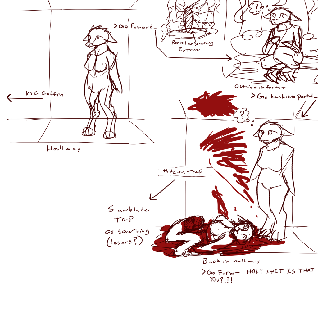 Anyway, I don't have the drive to go through with it and plan out all the puzzles and environments alongside figuring out how to not suck at drawing it. I'm not completely awful at art (I mean, I can draw past stick figure level) but my cheapass tablet('s pen?) broke and I don't draw enough to justify buying a new one. So it'd have to be mouse-drawn, which would take forever to look passable. Also, I play videogames a lot.