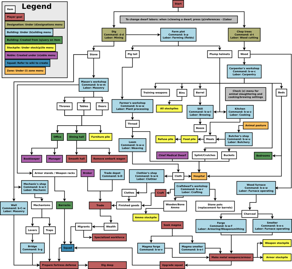 walls and other constructions are pretty straightforward, and the wiki does a good job laying out the tech trees for the various professions and crafts. Building and equipping a military and managing macro infrastructure are more advanced.