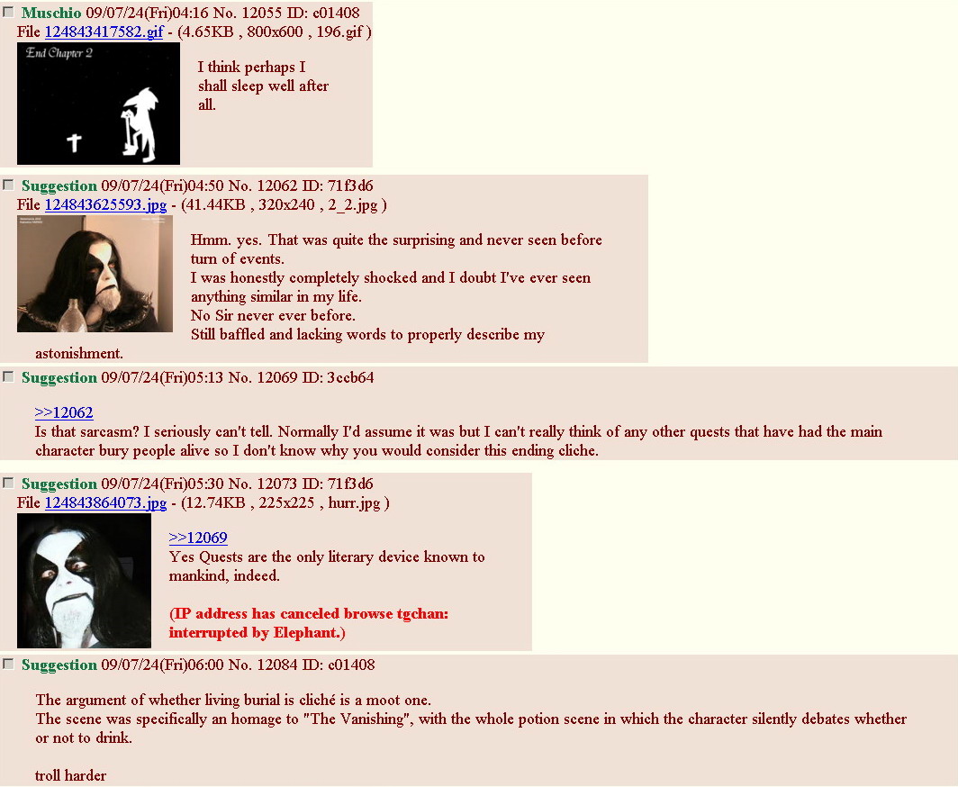 Would it have been so much trouble to actually voice your criticism in the regular way, rather than resorting to /v/-style reaction images and shit? I mean, you could've just said "I feel that the inclusion of live burial in any form or context is automatically trite, because it is so overused".