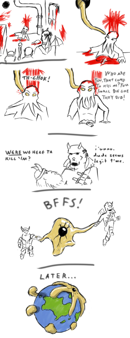 Some fought. They fought chain and threw them into the gears, others rushed the stairs, some falling dead, others roaring a challenge on sight of fallen brother. The men on the upper tier had little chance though - perhaps that was the blessing. Their deaths were quick, thrown into the machines below. Blood ran thick, and would be a terrible pain to get out of the gears.