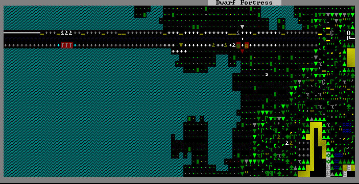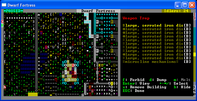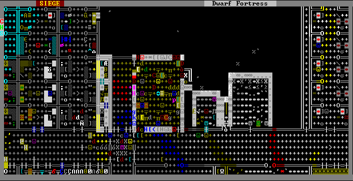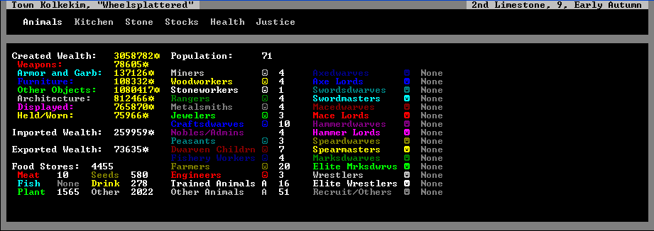 2 Limestone: autumn is here and our military failed in the most epic manner possible: several dwarves were lost (4 in total, if you count babies) due to an inability to tell where a location was and a refusal to pick up equipment because 'it doesn't match (seriously I have never had this 'equipment mismatch' error when arming my dwarves until this version, which is hilarious because according to the wiki there is nothing that should be triggering it and it should only refer to an older version. Fantastic.)' We're over 3 million in fortress value, and I'm giving up on our military for now. Until they can be danger room'd up to the point of not dying like idiots we're just going to have to close off the fort during sieges. To that effect, I have begun construction of a roof over the courtyard.