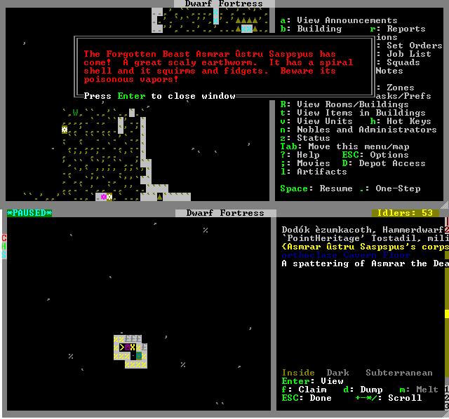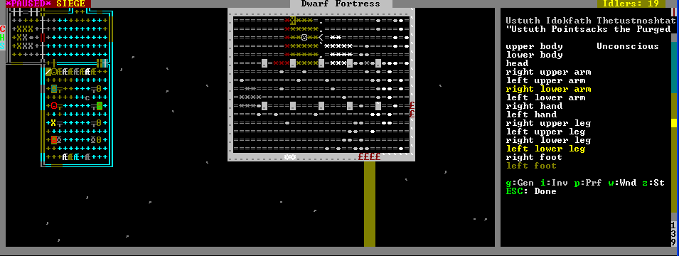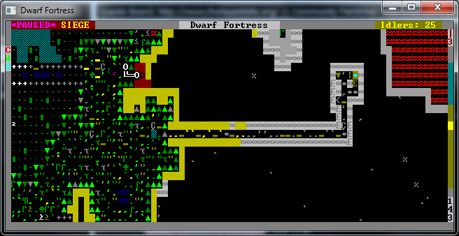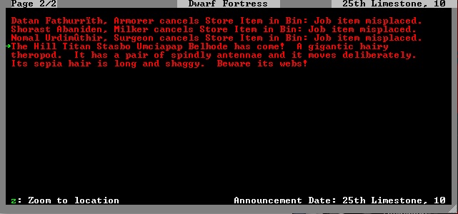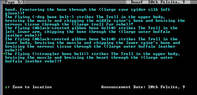 25 Galena: Goblin Ambush! The Walled shoves shot their hammerman leader in the chest and leg, the crossbowmen fled, and Ustuth casually walked up and decapitated him. Both of the mafols died when a second wave of invaders showed up and they decided to interpret 'station here' as 'run off to the other side of the map and try to melee the goblins with your crossbow.' At least the hammerdwarf mafol actually killed some goblins before dying like a retard. The military seriously needs to be fucking fixed. And now another hammerdwarf is killed by randomly deciding to run away from the goblin and magically being TOO FAST FOR ANYONE ELSE TO KEEP UP. Ustuth finally catches up and severs both of his feet with a pair of swings.