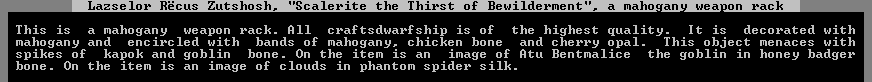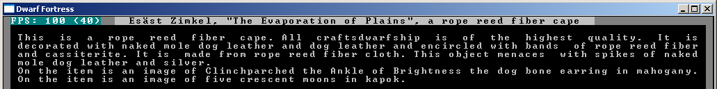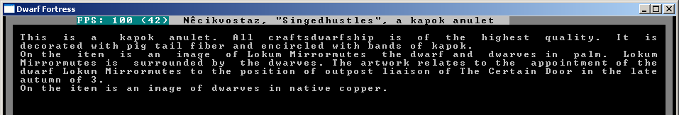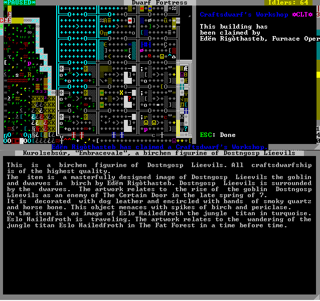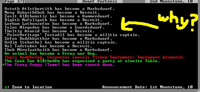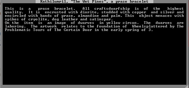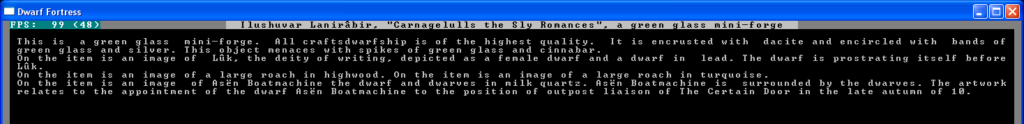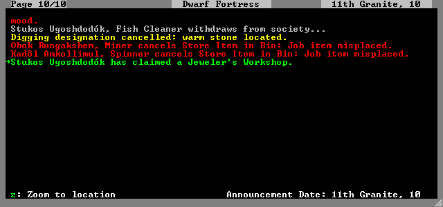 11 Galena: I am being positively bombarded with 'has created a masterpiece!' messages. We may well have our production back in line, with the exception of not having dwarves skilled in a number of fields.