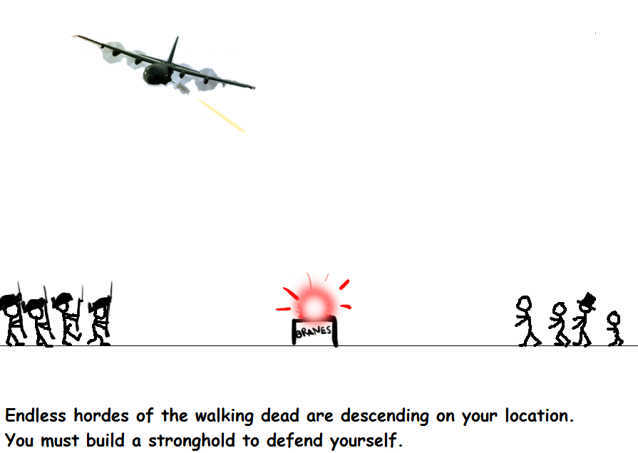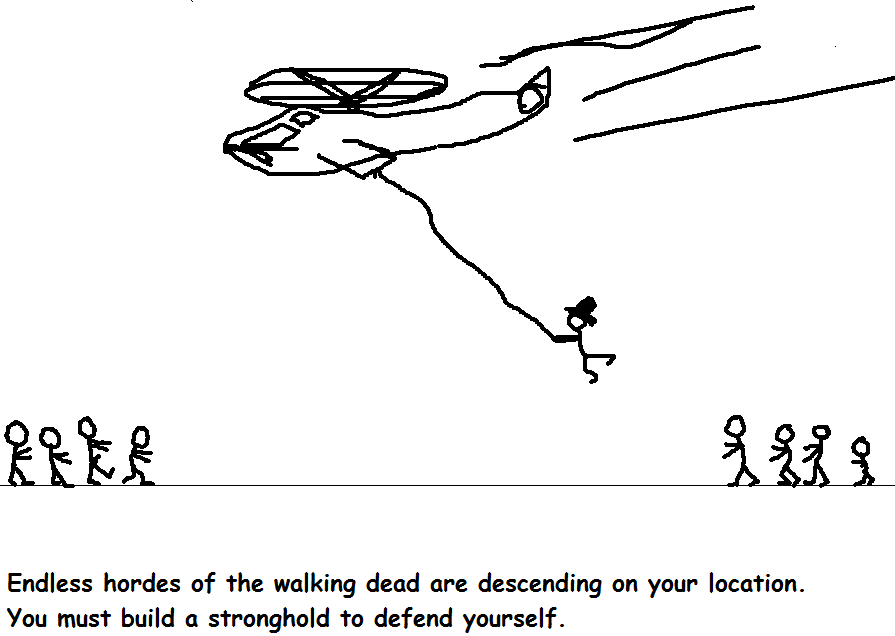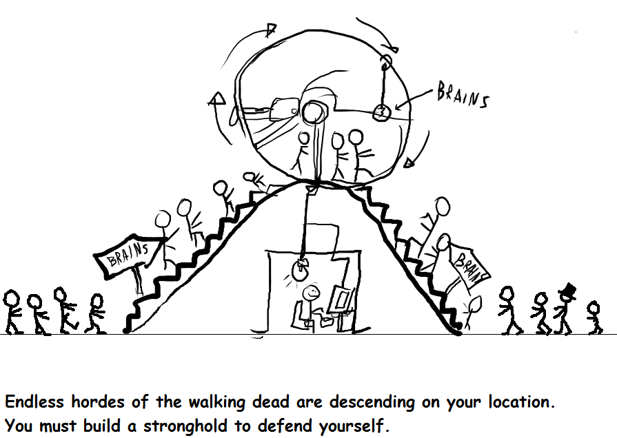 >>571How about this: a cabin on top of a rock. On the surface of the rock there are human (zombie) shaped holes. Each hole fits perfectly for one zombie.