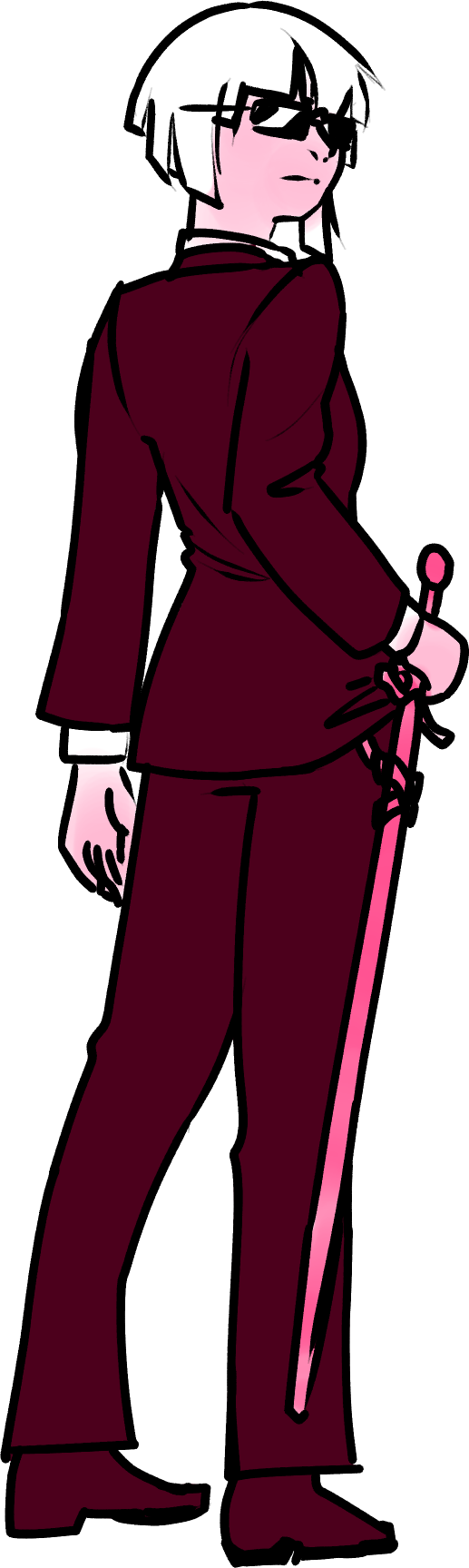 An image of Agent Gladii. They have a sharp bowl cut of white hair. Pink skin and a dark crimson suit. They are tall and lanky. They have a longsword on a sword belt. They wre wearing shades that hide their eyes.