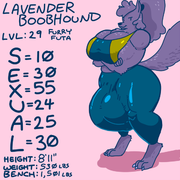 Lavender Boobhound is a Hyper Furry Futa. She is Violet's mother and owner of Horny Futa's favorite sex shop. Her physically imposing stature is due to her regular exercise regimen which includes intense cardio, weight training and yoga. She has also been practicing penis enlargement techniques since a young age. As a result, her genitals are tremendously outsized. Fully erect, her penis is larger than an adult man. Thanks to her "Ultra Balls" perk, she is capable of ejaculating hundreds of gallons worth of semen at a time, enough to coat a city block. Lavender's tremendous strength allows her to "Hulk leap" hundreds of yards into the air, but she has not yet perfected landing. She owns a Vespa scooter with the vanity license plate "REDRKT." The scooter was destroyed in the process of giving Horny Futa a lift to work. Lavender sees herself as something of a mentor to Horny Futa and is very fond of her. Unfortunately, her well-intentioned "lessons" often end up causing Horny Futa significant pain or consternation.