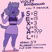 Lavender Boobhound is a demifur clerk at Horny Futa's favorite sex shop. She is somewhat jumpy and excitable, possibly in part due to her petite stature and canine roots. Horny Futa considers Violet her best friend in the world. Violet reciprocates, but has no compunctions against leveraging their friendship to make a sale. Her Ability stat is glitched when viewed by someone with the "Stat Vision" perk. She is fond of belly rubs.
